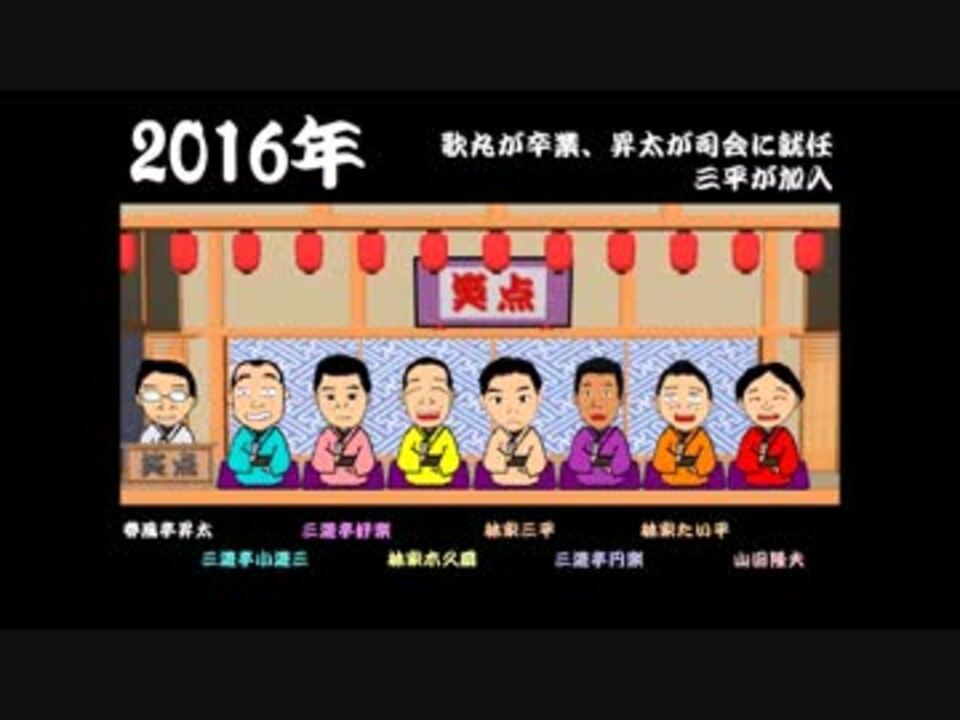 50周年を迎え、昇太師匠を司会に、新たに三平師匠を迎え入れ、新体制がスタートいたしました。そこで、新たなバージョンを作成いたしました!これからも応援していきましょう!例によって、後の詳しい説明は動画の冒頭をご覧くださいませ。。<br />おまけ・若手大喜利<a href="https://www.nicovideo.jp/watch/sm32349578" class="watch">sm32349578</a>、東西大喜利<a href="https://www.nicovideo.jp/watch/sm25472133" class="watch">sm25472133</a>、アナ大喜利&振袖大喜利<a href="https://www.nicovideo.jp/watch/sm30451831" class="watch">sm30451831</a>、正月特番<a href="https://www.nicovideo.jp/watch/sm30489586" class="watch">sm30489586</a>、「若手大喜利と亭号」<a href="https://www.nicovideo.jp/watch/sm29255446" class="watch">sm29255446</a><br />あげた物リスト→<a href="https://www.nicovideo.jp/mylist/52972534" target="_blank" rel="noopener">mylist/52972534</a>