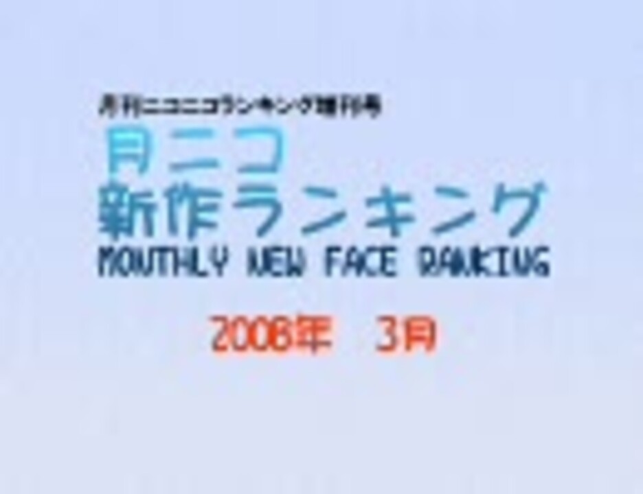 ★集計期間:3月1日6時~4月1日0時<br />★集計方法:再生数+コメント数×<font color="#ff0000">補正値</font>+マイリスト登録数×20<br /> 補正値:(再生数+マイリスト数)÷(再+コ+マ)<br /> 但し補正値が0.01以下のものは0.01とする<br />★集計対象:すべての各300位と全カテゴリ各100位(ランク外は0ポイント扱い)<br /> <font color="#ff0000">2008年3月に投稿された動画</font><br /><br />★トップ30へのリンクはこちらから→公開終了しました↓からどうぞ<br />★全集計結果一覧はこちらからどうぞ→<a href="http://www39.atwiki.jp/niconicoranking/" target="_blank" rel="noopener nofollow">http://www39.atwiki.jp/niconicoranking/</a><br />★総合→<a href="https://www.nicovideo.jp/watch/sm2909083" class="watch">sm2909083</a> 2008年4月→<a href="https://www.nicovideo.jp/watch/sm3209855" class="watch">sm3209855</a><br />★@カテゴリ3月分→<a href="https://www.nicovideo.jp/watch/sm2979450" class="watch">sm2979450</a><br /><br />★画質とエンコ時間の短さの誘惑に負けてH.264です。<br />★申し訳ありません4位編集ミスです。