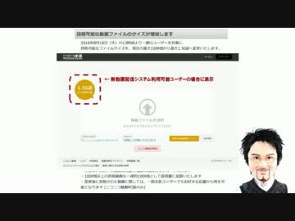 <font size="3" color="blue">皆さんこんにちは!!</font><br /><font size="3" color="red">Chiharu</font><font size="3" color="blue">と申します_(._.)_</font><br /><br />投稿可能な動画のファイルサイズ:最大100MB → 最大1.5GBに増えます!!<br />軽い説明と1.5GBの扱い方についてお話してきます。<br />喋りが硬い...<br /><br /><font color="red">追記:この動画があまり意味の無い物になりました。</font><br /><a href="http://blog.nicovideo.jp/niconews/ni062609.html" target="_blank" rel="noopener nofollow">http://blog.nicovideo.jp/niconews/ni062609.html</a><br />全ての動画がニコニコ側で再エンコードされることになり投稿者側がビットレートを調節する必要がありません。<br />投稿する際はオリジナル画質か1.5GBギリギリにエンコードした物を使った方がいいかもしれません。<br /><br />他実況→<a href="https://www.nicovideo.jp/mylist/54149482" target="_blank" rel="noopener">mylist/54149482</a><br />コミュニティ→co2834509<br />Twitter:<font color="blue">@Gunma_Chiharu</font><br />