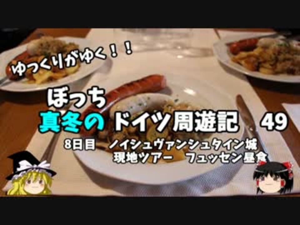 ノイシュヴァンシュタイン城を堪能したので、<br />お次は昼食です!<br />やはりドイツといったらソーセージ!<br />最後にヴィース教会にも寄っちゃいますよ!<br /><br />第1章・・・出発編<br />第2章・・・デュッセルドルフ編<br />第3章・・・ベルリン編<br />第4章・・・ミュンヘン編<font color="red">←今ココ</font><br />第5章・・・帰路編<br /><br /><font color="red">コミュ→co2910020</font><br />twitter→@ryontan<br /><br /><a href="https://www.nicovideo.jp/watch/sm29554067" class="watch">sm29554067</a>←前回 <font color="red">次回→50話<a href="https://www.nicovideo.jp/watch/sm29599199" class="watch">sm29599199</a></font><br /><br />今作 ドイツ周遊記→<a href="https://www.nicovideo.jp/mylist/54938346" target="_blank" rel="noopener">mylist/54938346</a><br />今作 車中泊旅行記→<a href="https://www.nicovideo.jp/mylist/54706524" target="_blank" rel="noopener">mylist/54706524</a><br />前作 北海道旅行記→<a href="https://www.nicovideo.jp/mylist/52618057" target="_blank" rel="noopener">mylist/52618057</a><br />前々作 アメリカ横断記→<a href="https://www.nicovideo.jp/mylist/48621785" target="_blank" rel="noopener">mylist/48621785</a><br />前前々作 イタリア周遊記→<a href="https://www.nicovideo.jp/mylist/45763559" target="_blank" rel="noopener">mylist/45763559</a><br />前前前々作 NY旅行記→<a href="https://www.nicovideo.jp/mylist/44343854" target="_blank" rel="noopener">mylist/44343854</a>