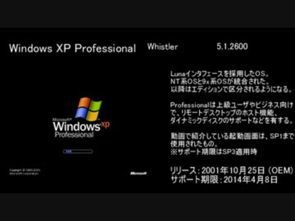 主にコンシューマ向けのx86対応OSを中心に構成しています。<br />そのため、Serverシリーズ、ARM系用など、x86以外を対象にしたOS、特殊用途向けのOS、Beta版は含まれていません。<br />解説は超適当なので誤りが含まれている可能性があります。ご注意ください。<br /><br />基本的に時系列順ですが、Windows NT3.51のみ特例でNT3.5の後になっています。<br /><br />後半はBGMも無いため無音が続きます、ご了承ください。<br /><br />参考サイト:Wikipedia等, 使用BGM:Windows XP ツアーBGM