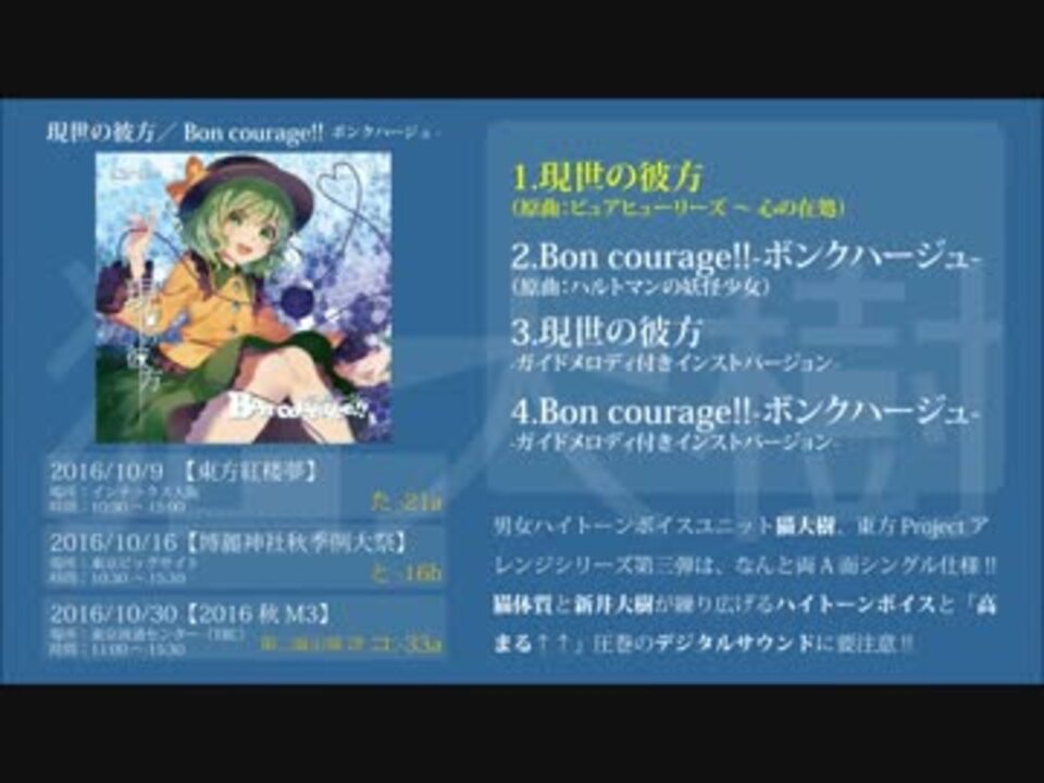 -YouTubeより転載-<br />タイトル「現世の彼方/Bon courage!!-ボンクハージュ-」<br />(原曲:ピュアヒューリーズ~心の在処、ハルトマンの妖怪少女)<br />サークル名「猫大樹」<br />作詞:猫体質<br />編曲:新井大樹<br />歌:猫体質&新井大樹<br />Illustrator:たらんぼマン<br /><br />【イベント】<br />2016年10月9日 東方紅楼夢 (猫大樹ブース:た-21a)<br />2016年10月16日 博麗神社秋季例大祭(猫大樹ブース:と-16b)<br />2016年10月30日 2016 秋 M3(猫大樹ブース:第二展示場2F コ-33a)<br /><br />上記イベント会場にて頒布予定!^^<br /><br />猫大樹公式ホームページ→<a href="http://www.nekohiroki.com/" target="_blank" rel="noopener nofollow">http://www.nekohiroki.com/</a><br />猫大樹公式Twitterアカウント→<a href="https://twitter.com/p_nekohiroki" target="_blank" rel="noopener nofollow">https://twitter.com/p_nekohiroki</a><br />猫体質Twitter→<a href="https://twitter.com/neko_taisitu" target="_blank" rel="noopener nofollow">https://twitter.com/neko_taisitu</a><br />新井大樹Twitter→<a href="https://twitter.com/hiroki_jubeat" target="_blank" rel="noopener nofollow">https://twitter.com/hiroki_jubeat</a><br />