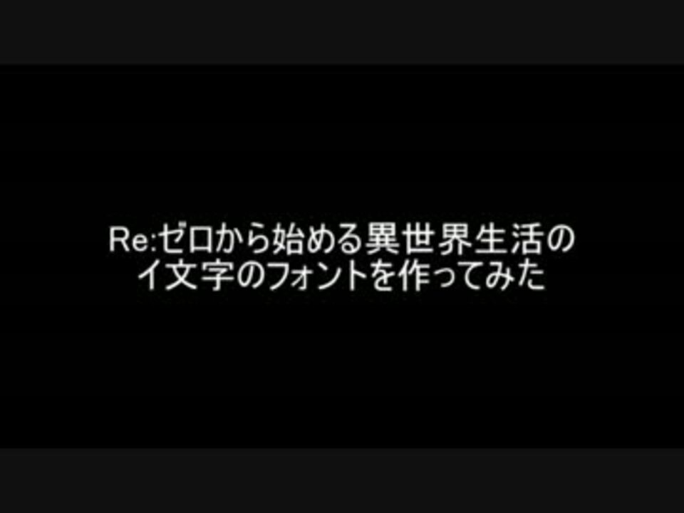 Re:ゼロから始める異世界生活という作品内で登場する文字の一種、「イ文字」をフォントにしてみました。<br />手書きなので少々汚いですが、探してもまだ無かったようなので作っちゃいました。<br /><br /><font size=5>※このフォントを使用する際は、この動画をコンテンツツリーに登録するようお願いします。※<br />※このフォントは商用利用などの目的での利用はご遠慮いただきますようよろしくお願いします。※</font><br /><br />[追記(16/9/25)]:ver1.1 小文字(ぁ,ぃ,ぅ,ぇ,ぉ,っ,ゃ,ゅ,ょ)を追加。<br />[追記2(16/9/28)]:ver1.1.1 ミス修正。<br /><br />参考にさせていただいたサイト様<br /><a href="http://matomame.jp/user/FrenchToast/74f40adc4605121919de" target="_blank" rel="noopener nofollow">http://matomame.jp/user/FrenchToast/74f40adc4605121919de</a><br /><a href="http://d.hatena.ne.jp/taida5656/20160516/p1" target="_blank" rel="noopener nofollow">http://d.hatena.ne.jp/taida5656/20160516/p1</a><br /><br />ダウンロードリンク<br /><a href="http://ux.getuploader.com/ReZERO_font" target="_blank" rel="noopener nofollow">http://ux.getuploader.com/ReZERO_font</a>