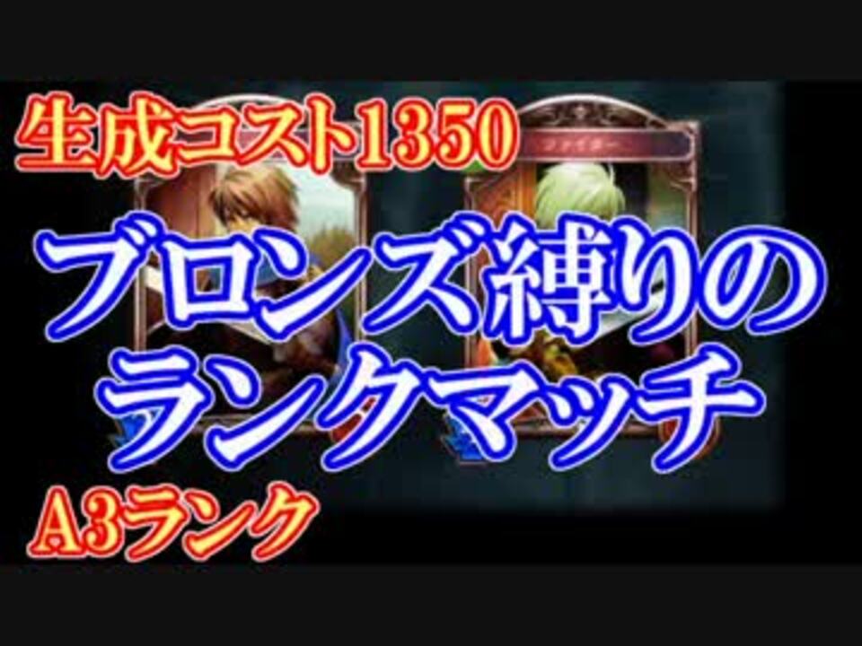 <font color="red"><font size="6">レジェンド、ゴールドがすべてではない!!<br />ブロンズカードに秘められし無限の可能性を今お見せしよう!!<br /><br /></font></font>生成コスト1350の格安デッキで、生成コスト2~3万のデッキを葬る快楽を貴方に。<br />※最後ウィッチ戦の7ターン目の自分の動き、編集中に頭を抱えました※<br /><br /><a href="#" class="seekTime" data-seekTime="1:57" onclick="seekNicoPlayer('#1:57'); return false;">#1:57</a> ~1戦目(ビショップ)<br /><a href="#" class="seekTime" data-seekTime="7:23" onclick="seekNicoPlayer('#7:23'); return false;">#7:23</a> ~2戦目(ドラゴン)<br /><a href="#" class="seekTime" data-seekTime="14:15" onclick="seekNicoPlayer('#14:15'); return false;">#14:15</a> ~3戦目(ウィッチ)<br /><br />前→<a href="https://www.nicovideo.jp/watch/sm29777416" class="watch">sm29777416</a> 次→<a href="https://www.nicovideo.jp/watch/sm29833470" class="watch">sm29833470</a><br /><br />【シャドバマイリス】<a href="https://www.nicovideo.jp/mylist/56607036" target="_blank" rel="noopener">mylist/56607036</a><br />【チャンネル】<a href="https://ch.nicovideo.jp/ainosensi" target="_blank" rel="noopener">ch.nicovideo.jp/ainosensi</a><br />【その他投稿作品】<a href="https://www.nicovideo.jp/mylist/34427287" target="_blank" rel="noopener">mylist/34427287</a> 【コミュ】co2035980 【Twitter】@ainosensi2<br />【サブ垢】<a href="https://www.nicovideo.jp/user/52667187" target="_blank" rel="noopener">user/52667187</a>(こちらにも動画投稿中)