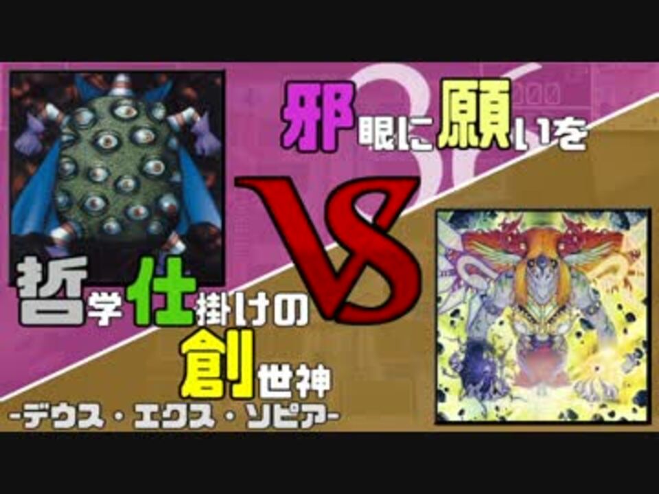 どうもしろなです。遊戯王対戦動画第七十七回です。<br /><br /><font size="3">幾度かの登場を経てついに…<br /><br /><font size="5"><b>新メンバー「めた」参戦!</b></font></font><br /><br /><br /><b>※左の人の構築が1,2戦目で微妙に変わっています。ご了承ください。</b><br /><br />左 しろな【邪眼に願いを】 vs 右 めた【哲学仕掛けの創世神(デウス・エクス・ソピア)】<br /><br /><a href="#" class="seekTime" data-seekTime="22:38" onclick="seekNicoPlayer('#22:38'); return false;">#22:38</a> 哲学仕掛けの創世神 紹介<br /><a href="#" class="seekTime" data-seekTime="28:19" onclick="seekNicoPlayer('#28:19'); return false;">#28:19</a> 邪眼に願いを 紹介<br /><br />※プレイミスかと思ったらまず遊戯王wikiへ⇒<a href="http://yugioh-wiki.net/" target="_blank" rel="noopener nofollow">http://yugioh-wiki.net/</a><br /><br />【Twitter】しろな⇒<a href="http://twitter.com/shirona728" target="_blank" rel="noopener nofollow">http://twitter.com/shirona728</a><br /> めた⇒<a href="http://twitter.com/meta_logical" target="_blank" rel="noopener nofollow">http://twitter.com/meta_logical</a><br /><br />【コミュニティ】⇒co1861032<br />【Freeデュエルマイリスト】⇒<a href="https://www.nicovideo.jp/mylist/35128502" target="_blank" rel="noopener">mylist/35128502</a><br />【闇のゲームマイリスト】⇒<a href="https://www.nicovideo.jp/mylist/29773230" target="_blank" rel="noopener">mylist/29773230</a><br />その35⇒<a href="https://www.nicovideo.jp/watch/sm27478009" class="watch">sm27478009</a> その37⇒<a href="https://www.nicovideo.jp/watch/sm29923365" class="watch">sm29923365</a>