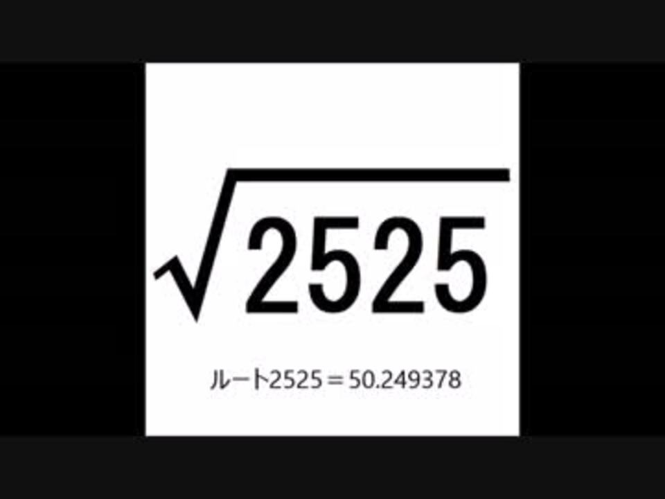 boniです。17作目の改変版(改悪?改良?)です。<br />今回はいつもニコニコさんにお世話になっているので、ルート2525を使って曲を作ってみました。<br />ルート2525=50.24937810560445135109632456379…、<br />の小数点以下29桁までを使い<br />主旋律に0=下シ♭ 1=ド 2=レ 3=ミ♭ 4=ファ <br />5=ソ 6=ラ♭ 7=シ♭ 8=上ド 9=上レ <br />をあてはめて曲を作ってみました。 <br />ニコニコできるような楽しい曲が良かったが・・、運営さんごめんなさいw<br />・・5拍子だし。<br />例 1.234→ドレミ♭ファ 2.467→レファラ♭シ♭ てな感じです。<br /><br /><br />2016.11.16 の 本日のオススメありでした。<br />運営の皆様、10周年誠におめでとうございます。<br /><br />本祭は ニコニコ10周年記念祭り タグよりお願いします。