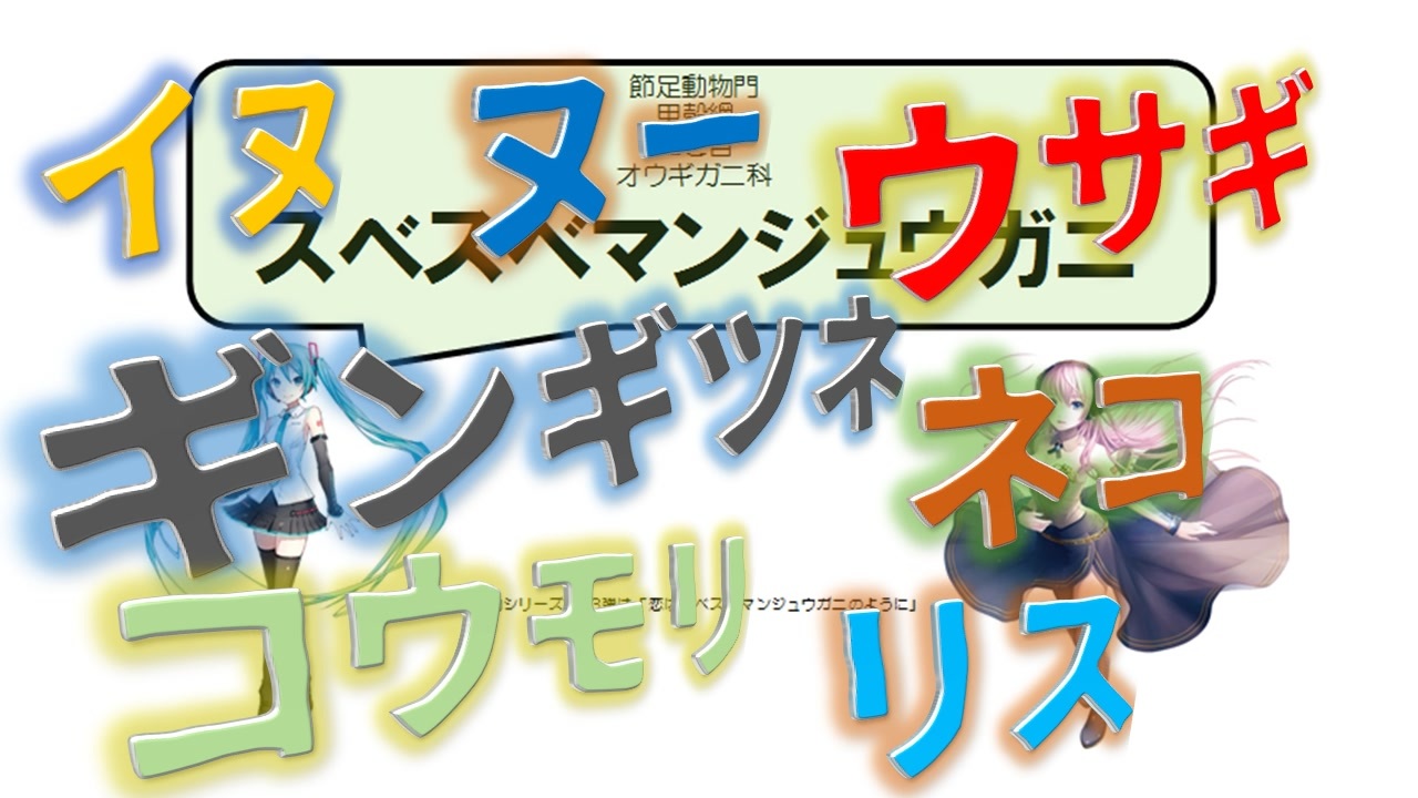 101曲目となるこの曲はただひたすら動物でしりとりをする歌です<br>一応動物門によって色分けしてあるのでその辺もお楽しみくださいね~<br>作詞・曲:unui( <a href="https://twitter.com/unui" target="_blank" rel="noopener nofollow">https://twitter.com/unui</a> )<br>アレンジ:tatmos( <a href="https://twitter.com/tatmos" target="_blank" rel="noopener nofollow">https://twitter.com/tatmos</a> )<br><br><歌詞><br>アルパカ カモシカ カモノハシ シロサイ インドゾウ<br>ウシ シカ カバ バク クマ マナティ イヌ ヌー ウサギ<br>ギンギツネ ネコ<br>コウモリ リス スナネズミ<br>ミーアキャット トラ ラクダ<br>ダチョウ ウミウ ウグイス スズメ<br>メンフクロウ ウミネコ<br>コモドオオトカゲ ゲンゴロウブナ ナンヨウハギ ギギ<br>ギンザメ メカジキ キビナゴ ゴンズイ<br>イシダイ イシモチ チョウチンアンコウ<br>ウミウシ<br>シャコガイ イイダコ コウモリダコ コウイカ カタツムリ<br>リュウグウオキナエビスガイ イガイ イソゴカイ<br>イソギンチャク クラゲ<br>ゲンジボタル ルリタテハ ハサミムシ ショウジョウバエ<br>エンマコオロギ ギンヤンマ マツムシ ショウリョウバッタ<br>タマムシ シデムシ シラミ ミズスマシ シミ ミンミンゼミ<br>ミヤマクワガタ タイコウチ チョウ ウスバカゲロウ<br>ウデムシ シタムシ<br>シロボヤ<br>ヤツメウナギ ギボシムシ シャコ コガネグモ モロコ<br>コウガイビル ルリオトシブミ ミジンコ コナダニ <br>ニシキヘビ ビンナガ ガンガゼ ゼニガメ メンダコ<br>コロギス スベスベマンジュウガニ ニベ ベンテンウオ<br>オルカ カブトガニ<br>ニギス スカンク クマムシ シギ ギフチョウ ウミシダ<br>ダイオウイカ カマキリモドキ キビタキ キュウリウオ<br>オオウミガラス<br>スカシカシパン ん!?