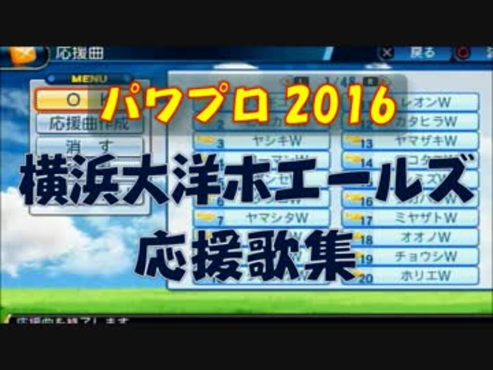 パワプロ2016の応援曲モードで作りました。横浜大洋ホエールズの応援歌集です。<br />投手応援歌など球場未使用の曲は、キーを調整しました。<br /><br />0:01~ 高木豊<br />0:29~ 加藤博一<br />0:57~ 屋鋪要<br />1:24~ D・ローマン<br />1:52~ C・ポンセ<br />2:29~ 田代富雄<br />2:57~ 山下大輔<br />3:25~ 若菜嘉晴<br />3:54~ メイン<br />4:32~ 谷繁元信<br />5:00~ L・リー<br />5:27~ 片平晋作<br />5:55~ 山崎賢一<br />6:42~ 横谷彰将<br />7:10~ 清水義之<br />7:38~ 高橋眞裕<br />8:05~ 宮里太<br />8:33~ 大野雄次<br />9:01~ 銚子利夫<br />9:28~ 堀江賢治 <br />9:56~ J・パチョレック<br />10:37~ J・マイヤー<br />11:05~ R・レイノルズ<br />11:33~ 市川和正<br />12:01~ 進藤達哉<br />12:29~ 村岡耕一<br />12:57~ 石橋貢<br />13:25~ 石井琢朗<br />13:53~ 代打<br />14:29~ 投手