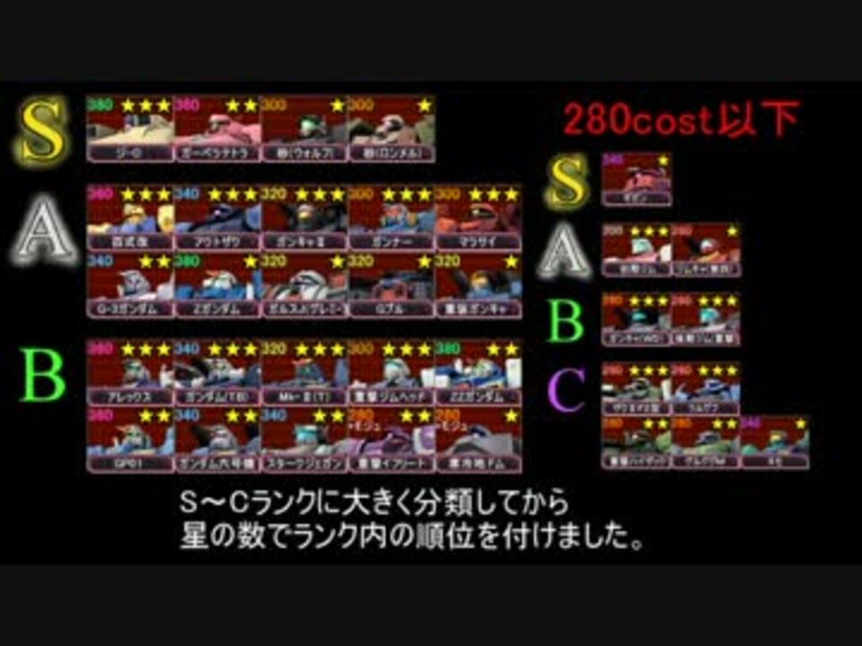 上位プレイヤーの意見を参考にガンダムオンライン機体評価ランクを作りました。<br />その評価に基づき、今回は中~高コストのSランク機体を解説していこうと思います。<br />詳しく知りたい人は⇒【<a href="https://ch.nicovideo.jp/article/ar1015952" target="_blank" rel="noopener">ar1015952</a>】の機体評価ランク記事までどうぞ。<br /><br />共に機体評価をしてくれたcruz氏、動画の素材を提供してくれた小物氏と種マシンガン氏<br />そして、沢山の意見を下さったプレイヤーの皆様に深く感謝を致します。<br /><br />次回⇒DX43解説してみた。連邦編【<a href="https://www.nicovideo.jp/watch/sm30920641" class="watch">sm30920641</a>】<br /><br />基本的に、自分はニコ生でガンオン&ゲーム配信やってます。<br />後藤 清(Gootuan)のコミュ 【co2661140】<br /><br />お気に入り⇒【<a href="https://www.nicovideo.jp/user/696700" target="_blank" rel="noopener">user/696700</a>】<br />過去の動画⇒【<a href="https://www.nicovideo.jp/mylist/54963322" target="_blank" rel="noopener">mylist/54963322</a>】<br /> twitter ⇒【@Gootuan_jp】<br />