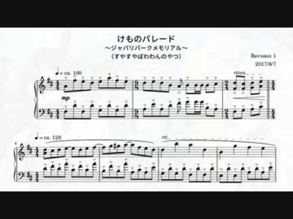 お久しぶりです。「Japari café」およびサウンドトラックの発売おめでとうございます。<br />どちらのCDも文句なしの名曲揃いですが、今回はNACK5で先行試聴できたこの曲をアレンジしました。フェネックの「アライさん前出すぎ〜」が超かわいいと思います。<br />編曲についてですが、ジャンプ力ぅ…ですかねぇ…。<br /><br />楽譜: <a href="https://goo.gl/laf4Gi" target="_blank" rel="noopener nofollow">https://goo.gl/laf4Gi</a> <br />他のBGM: <a href="https://www.nicovideo.jp/mylist/58537545" target="_blank" rel="noopener">mylist/58537545</a> <br /><br />広告ありがとうございます!<br />次は何作ろうかなあ。作りかけが溜まってる…。<br />【追記】自分のこの曲に関する感覚はあくまでも4拍子で、12/8か4/4にするかは記譜上の問題だと思っています。12/8はすっきりしますが、4/4は四分-八分のまとまりが連符のブラケットで囲まれていてわかりやすいというメリットがあります。