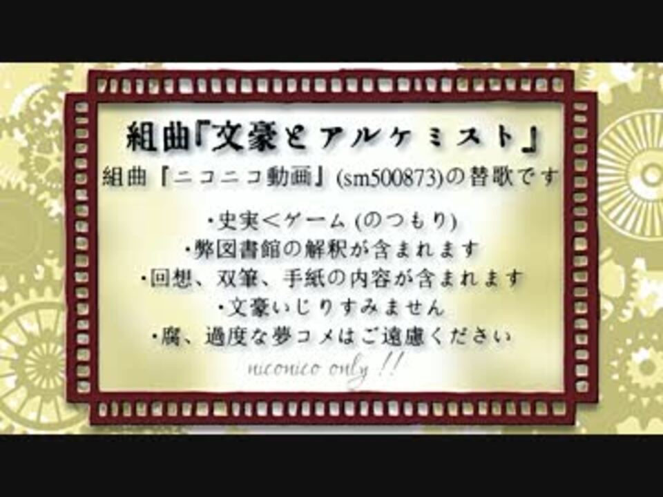 <font size="+2">お粗末さまでした。</font><br>組曲本家様10周年&1000万再生おめでとうございます!<br><br>偏りが激しいです、特にKOYO先生推しのお司書はんごめんなさい…!あと館長出てきません!<br>精神不安定って一瞬で双筆ゲージ溜まってびっくりする。文アルまいりす →<a href="https://www.nicovideo.jp/mylist/58668488" target="_blank" rel="noopener">mylist/58668488</a><br><br><b>たくさん広告ありがとうございます!書ききれないのでお礼と動画の補足まとめました →<a href="https://ch.nicovideo.jp/article/ar1162180" target="_blank" rel="noopener">ar1162180</a> 続編→<a href="https://www.nicovideo.jp/watch/sm32186401" class="watch">sm32186401</a></b><br><br>追記:思いの外タイトルまで見ていただき嬉しいやら恥ずかしいやらありがとうございます。完全にその場の思いつきなのでもっと熟考するんだった<br>あとすごくどうでもいいけど音声波形の線は41本です<br>追記2:<b>人力動画作っていただきました!!!みて!→<a href="https://www.nicovideo.jp/watch/sm32507243" class="watch">sm32507243</a></b>