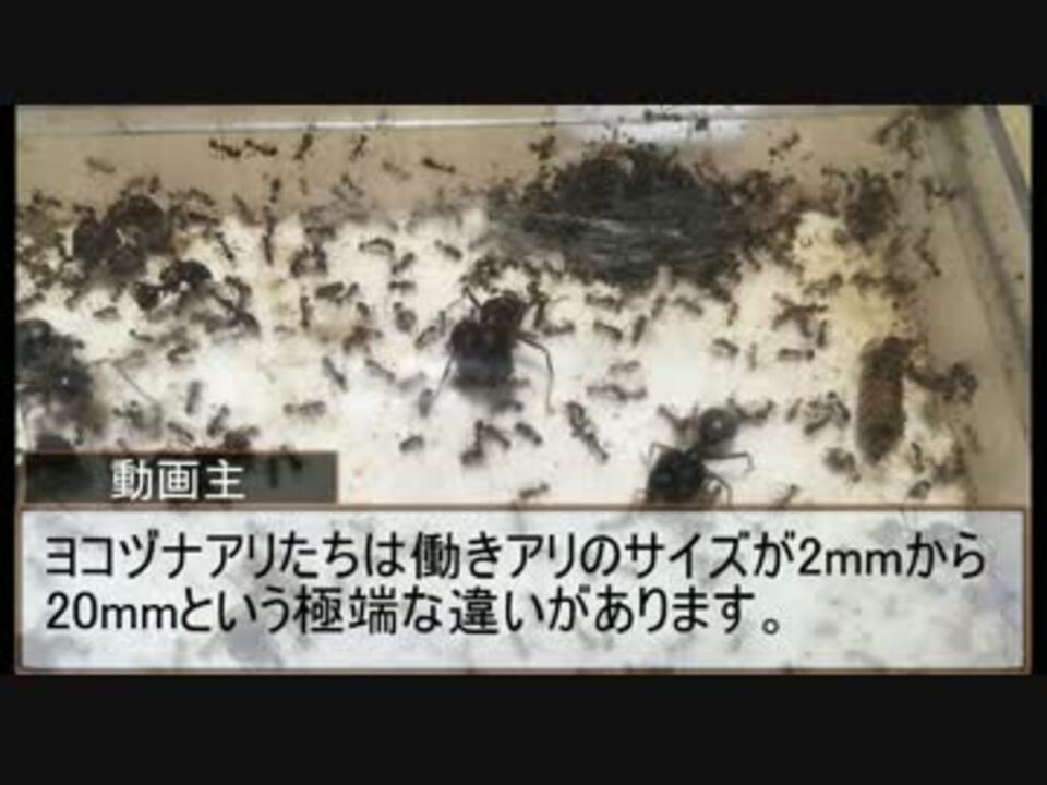小さなアリの世界の素晴らしさが伝わればうれしいです。お気軽にコメントしてどうゾ<br />前<a href="https://www.nicovideo.jp/watch/sm31542119" class="watch">sm31542119</a> <a href="https://www.nicovideo.jp/mylist/59262330" target="_blank" rel="noopener">mylist/59262330</a> 次<a href="https://www.nicovideo.jp/watch/sm31649101" class="watch">sm31649101</a> 速報!!クロオオアリさん第一子誕生<a href="https://www.nicovideo.jp/watch/sm31554286" class="watch">sm31554286</a> <br />解 説 ヨコヅナアリ<br />小型働きアリの体長2.5 mm。体色は黄褐色から赤褐色。<br />サイズの相違によって働きアリ間で分業が行われ,さらに小型働きアリでは羽化後間もない個体は幼虫の世話等をよく行い,古い個体になるとより多くの種類の仕事を行なうという日齢による分業も見られる また顕著なアリ道を作り,多くの働きアリがそこを行き交う。。このアリ道を利用して昆虫等の小動物を捕える 捕食性が強い種であるが,甘露も好むようである。<br />良ければフォローください <a href="https://twitter.com/arinko114514" target="_blank" rel="noopener nofollow">https://twitter.com/arinko114514</a>