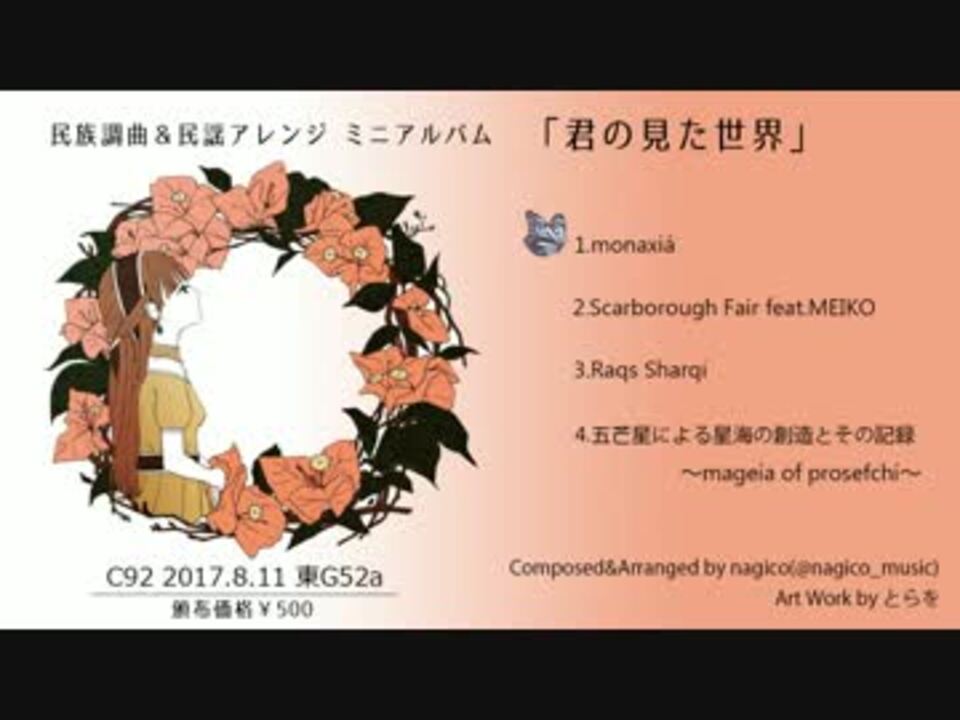 C92 1日目(8.11)東G52a にて頒布<br /> 「君の見た世界」クロスフェード<br /> <br /> 民族調オリジナル曲&民謡アレンジ全4曲 (頒布価格600円)<br /> 手数料の関係で600円になりました。ご了承ください。<br /> <br /> 通販:<a href="https://nagico.booth.pm/" target="_blank" rel="noopener nofollow">https://nagico.booth.pm/</a><br /> <br /> mail:nagico0113@gmail.com<br /> twitter:@nagico_music