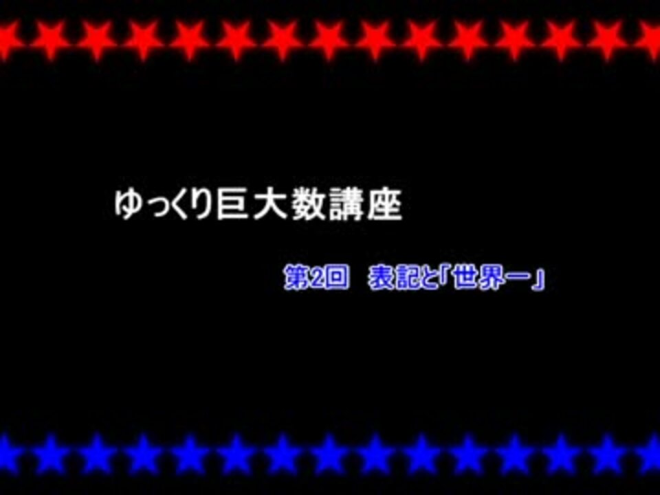 思いのほか遅くなってしまいました。今回からBGMありです。<br />あと、今回動画時間が長いです。画質が悪かったらすみません。<br />今回からいよいよ巨大数らしくなってきます。解説が雑な所があったらすみません(2回目)。<br /><br /><b>とても<font color=red>大きな数</font>について解説していきます。</b>数学初心者でもなるべく分かるようにしていく所存です。<br />前→ <a href="https://www.nicovideo.jp/watch/sm31258129" class="watch">sm31258129</a> 次→ <a href="https://www.nicovideo.jp/watch/sm31897920" class="watch">sm31897920</a><br />巨大数講座一覧→ <a href="https://www.nicovideo.jp/mylist/59089039" target="_blank" rel="noopener">mylist/59089039</a><br />BGM:甘茶の音楽工房