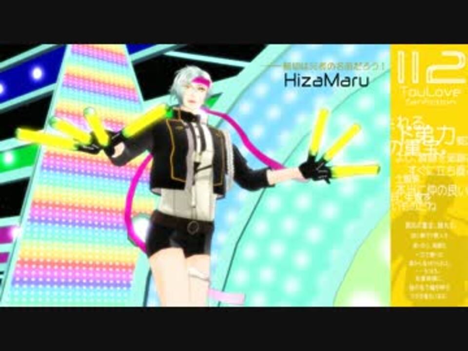 やぁ。色々本丸が様変わりしたみたいだね、嬉しいね。<br>そんな中、動画が出来たから投稿するよ。<br>前回(<a href="https://www.nicovideo.jp/watch/sm31707135" class="watch">sm31707135</a>)も再生・マイリスト・コメント・タグ等ありがとう。<br>見ての通り一枚絵はMMD仕立てだけど、元は所謂……クールビズ丸?を活かしたかった結果、<br>こういう物が出来たんだ。<br>画質・音質の悪さ、調声の甘さ等はごめんね?<br>原曲はこちら:<a href="https://www.nicovideo.jp/watch/sm1715919" class="watch">sm1715919</a><br><br><br><br>そうだ、利き企画に参加したから、良かったら聴いてみてね: <a href="https://www.nicovideo.jp/watch/sm32847793" class="watch">sm32847793</a><br>マイリストだよ:<a href="https://www.nicovideo.jp/mylist/55084037" target="_blank" rel="noopener">mylist/55084037</a><br><br>*そういえば……黄色の歌詞、「どうしたの?」ってとこね。<br>アレ弟の声まねだから(<a href="https://www.nicovideo.jp/watch/sm30979338" class="watch">sm30979338</a>参照)それも含めて聴いてね。<br><br>22/10/14 脇差さん、あいさん、榊和*さん、ミカエル☆さん、こ゚やさん、豊後国審神者さん、検非違使さん、美濃の源氏あつめ審神者さん、相模国審神者さん、ユーシマさん、抹茶狐さん、幻鏡さん、ゆうしまさん、piyonさん、さにわさん、らすらるさん、広告ありがとう。
