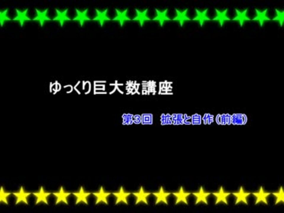 今回から基本的に前後編式です。前編と後編の投稿間隔はなるべく短くなるように努めます。<br />今回全体的にテンポが早く難解な内容を含むため、一時停止しながらの視聴を推奨します。<br /><br /><b>とても<font color=red>大きな数</font>について解説していきます。</b>数学初心者でもなるべく分かるようにしていく所存です。<br />前→ <a href="https://www.nicovideo.jp/watch/sm31716680" class="watch">sm31716680</a> 次→ <a href="https://www.nicovideo.jp/watch/sm31940678" class="watch">sm31940678</a><br />巨大数講座一覧→ <a href="https://www.nicovideo.jp/mylist/59089039" target="_blank" rel="noopener">mylist/59089039</a><br />BGM:甘茶の音楽工房