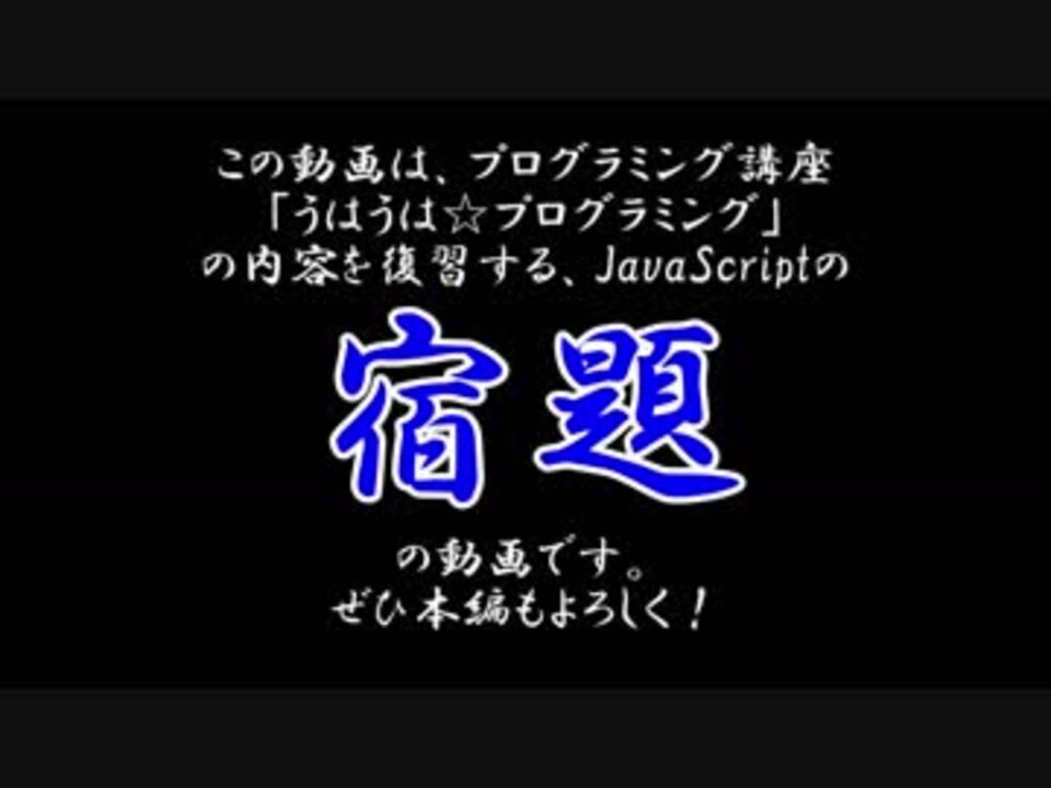 札束の風呂に入ってウハウハになりたい素人に、プログラミングを教えます!<br />という講座の宿題です。<br /><br />講師:Revin <a href="https://twitter.com/rev84" target="_blank" rel="noopener nofollow">https://twitter.com/rev84</a><br />生徒:やられ <a href="https://twitter.com/yanao331" target="_blank" rel="noopener nofollow">https://twitter.com/yanao331</a><br /><br />YouTube:<a href="https://goo.gl/FjZ6ui" target="_blank" rel="noopener nofollow">https://goo.gl/FjZ6ui</a><br />教材:<a href="https://github.com/rev84/uhauha_programming" target="_blank" rel="noopener nofollow">https://github.com/rev84/uhauha_programming</a><br />本編マイリスト:<a href="https://www.nicovideo.jp/mylist/59061583" target="_blank" rel="noopener">mylist/59061583</a><br />宿題マイリスト:<a href="https://www.nicovideo.jp/mylist/59781918" target="_blank" rel="noopener">mylist/59781918</a><br />最初:<a href="https://www.nicovideo.jp/watch/sm31810972" class="watch">sm31810972</a><br />前:<a href="https://www.nicovideo.jp/watch/sm31855746" class="watch">sm31855746</a><br />次:やられ、家を長く離れるので10月上旬予定