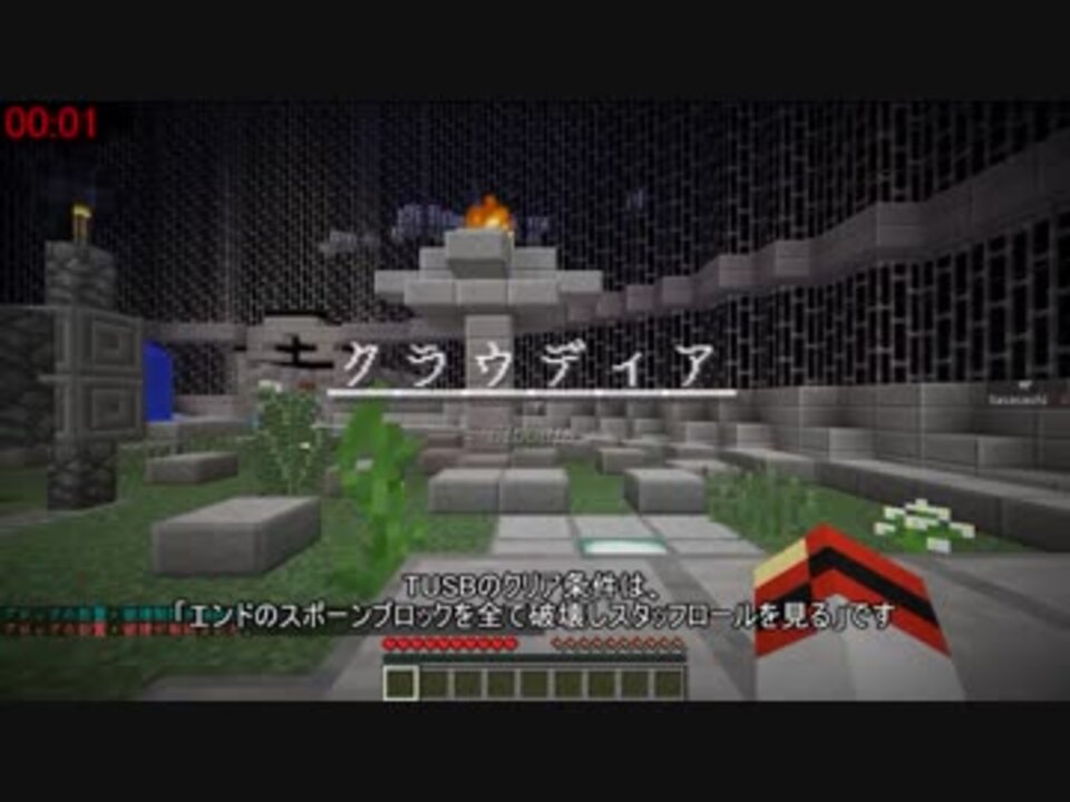 Minecraftの配布マップ、The Unusual SkyBlock ver12.0.8bのTAです。<br>エンドのスポーンブロックを全て破壊後、エンドのポータルフレームにエンダーアイをはめたときの表示タイムを攻略タイムとします。<br>本来のクリア条件はエンダーアイをはめることではなくスタッフロールを見ることなので、それとは異なっている点、ご了承ください。<br><br>TAかつ字幕解説という都合上、ネタバレ要素が豊富にあります。<br>注意してご視聴ください。<br>(追記(1/21) 記録更新しました→<a href="https://www.nicovideo.jp/watch/sm32619640" class="watch">sm32619640</a>)<br><br>TUSB公式→<a href="https://skyblock.jp/" target="_blank" rel="noopener nofollow">https://skyblock.jp/</a><br>TUSBプレイ時の注意 <a href="https://sasasashi.livedoor.blog/archives/11566420.html" target="_blank" rel="noopener nofollow">https://sasasashi.livedoor.blog/archives/11566420.html</a><br><br>後編→<a href="https://www.nicovideo.jp/watch/sm32053163" class="watch">sm32053163</a><br>スキル縛りでTUSB!シリーズ→<a href="https://www.nicovideo.jp/mylist/58422593" target="_blank" rel="noopener">mylist/58422593</a><br>Youtubeチャンネル→<a href="https://www.youtube.com/channel/UCPE24PpYcbkfGkMH_9shXnw" target="_blank" rel="noopener nofollow">https://www.youtube.com/channel/UCPE24PpYcbkfGkMH_9shXnw</a><br>
