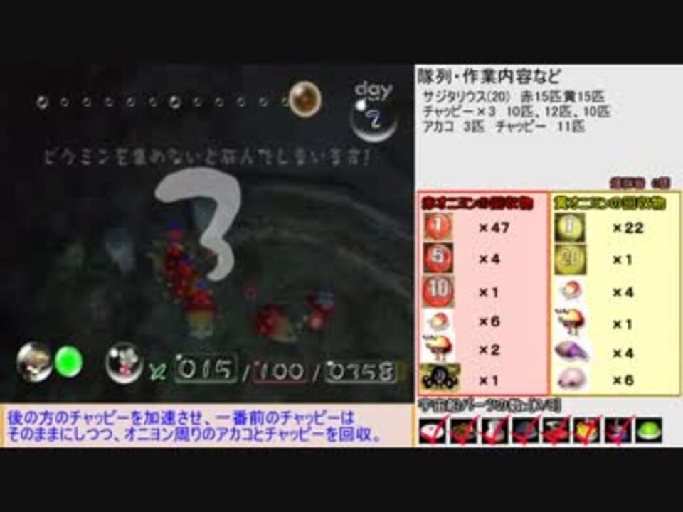 2日目開始から終了まで<br /><br />この動画では、6日でクリアしつつ原生生物やペレットも含めて「全回収」することを<br />目的としています。(ただし2日目のオタマは除く)<br />そのため、「最速」は一切目指していません。ご理解をお願いいたします。<br /><br />今回は、無事達成しました。改善できる箇所はありますが、目的は達成したので、更新はしません。<br />もし、回収物やカウントに間違いがありましたら、ご指摘をお願いいたします。<br />追記回数:累計24891回(5:42あたりから:7715回、2日目全体:24681回)<br /><br />旧3日目(時間切れ)→<a href="https://www.nicovideo.jp/watch/sm32581401" class="watch">sm32581401</a><br />3日目(全回収達成)→<a href="https://www.nicovideo.jp/watch/sm33072841" class="watch">sm33072841</a><br /><br />1日目→<a href="https://www.nicovideo.jp/watch/sm30565699" class="watch">sm30565699</a><br />旧旧2日目(ヘビガラス前まで)→<a href="https://www.nicovideo.jp/watch/sm30690624" class="watch">sm30690624</a><br />旧旧2日目(日没まで)→<a href="https://www.nicovideo.jp/watch/sm30767673" class="watch">sm30767673</a><br />旧2日目→<a href="https://www.nicovideo.jp/watch/sm31814217" class="watch">sm31814217</a><br />