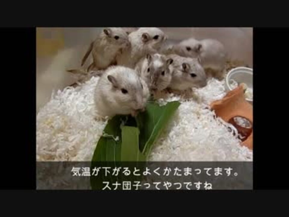 前:<a href="https://www.nicovideo.jp/watch/sm31947356" class="watch">sm31947356</a>次:<a href="https://www.nicovideo.jp/watch/sm32391056" class="watch">sm32391056</a><br /><br />スナネズミマイリスト:<a href="http://www.nicovideo.jp/mylist/57705913" target="_blank" rel="noopener nofollow">http://www.nicovideo.jp/mylist/57705913</a><br /><br />祝ニコニコトップ<br /><br />たくさんの人に見てもらって嬉しい限りです<br />コメントもたくさんいただいたので、ちょっと紹介します<br /><br />スナネズミという名前の通りネズミの仲間です。<br />英語でジャービル(モンゴリアンジャービル)と言います<br />漫画「動物のお医者さん」でよく登場した動物でもあります<br />砂地ではないかもしれませんが、元々は乾燥地帯に住みます<br />ハムスターとは違い、尻尾が長く、尻尾にふさふさとした毛が生えてるのが特徴的です<br />多頭飼いは相性の問題とはなります。親兄弟など幼少の頃から一緒にいる場合は上手くいきやすいようです<br />食性は草食よりの雑食性で、野菜はよく食べますね<br /><br />7匹います