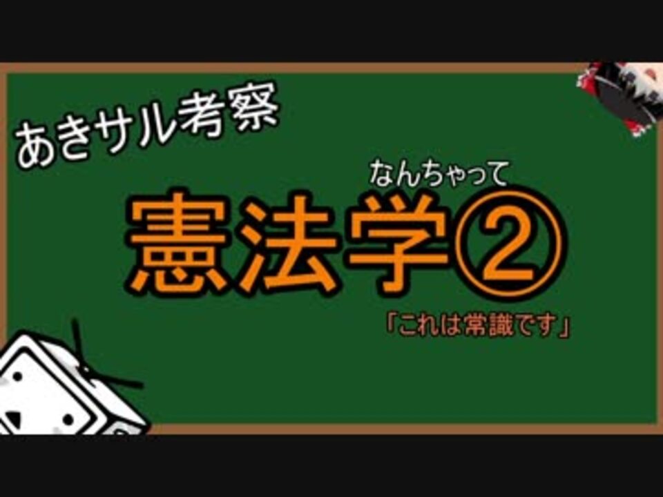 サル脳の主のサルでもわかる憲法<br /><br />前回>なんちゃって経済学⑨><a href="https://www.nicovideo.jp/watch/sm32091524" class="watch">sm32091524</a><br />次回>なんちゃって憲法学③><a href="https://www.nicovideo.jp/watch/sm32356101" class="watch">sm32356101</a><br />なんちゃって憲法学シリーズpart1><a href="https://www.nicovideo.jp/watch/sm31141372" class="watch">sm31141372</a><br />あきサル考察マイリスト><a href="https://www.nicovideo.jp/mylist/58506893" target="_blank" rel="noopener">mylist/58506893</a><br />