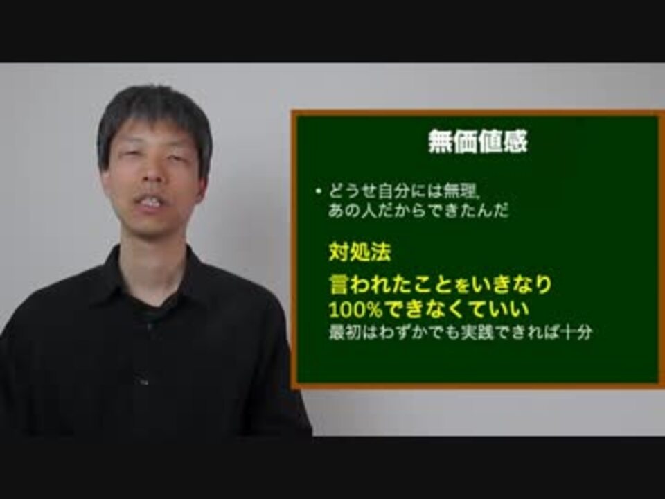 最初 <a href="https://www.nicovideo.jp/watch/sm33172106" class="watch">sm33172106</a>|前 <a href="https://www.nicovideo.jp/watch/sm33212081" class="watch">sm33212081</a>|次 <a href="https://www.nicovideo.jp/watch/sm33230461" class="watch">sm33230461</a><br />心理・真理の話 1 <a href="https://www.nicovideo.jp/watch/sm28253116" class="watch">sm28253116</a>|動画リスト <a href="https://www.nicovideo.jp/mylist/54884549" target="_blank" rel="noopener">mylist/54884549</a><br /><br />電子書籍『メンタルブロックから自由になってもっと動けるようになる!』<br /><a href="https://amazon.jp/dp/B00MB03W34" target="_blank" rel="noopener nofollow">https://amazon.jp/dp/B00MB03W34</a> の音声解説です。<br /><br />「自分にとって価値がない」は<br />「他人にとって価値がない」とはかぎりません。<br /><br />学んだことをすぐに100%実践するのは<br />ハードルが高すぎることもあります。<br />少しずつ行動していけばOKです。<br />教えている側もすぐに身につけられたわけではありません。<br /><br />■BGM<br />Sweet vermouth,作曲:watson<br />フリーBGM・音楽素材MusMus<br /><a href="http://musmus.main.jp/" target="_blank" rel="noopener nofollow">http://musmus.main.jp/</a>