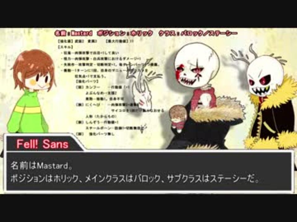 ダイスの女神さまはわかってらっしゃる 。<br /><br />続きました、Doll作成編です。<br /><br />無いとは思いますが、<font color="#ff0000"><b><u>無断転載禁止です。</u></b></font><br />アンダーテールもネクロニカもはまってまだ3ヶ月の新参者なので、間違いやミスを発見した方は優しく教えてください。<br /><br />〈謝罪〉<br /> 早速ミスが…<br /> ・Mustard…<font color="#ff0000">スチールボーン削除</font><br /> ・Ketchup…<font color="#ff0000">行動値10に訂正</font> <br /> <font color="#ff0000">〈盤上の駒〉行動値-2に修正</font><br /> 教えて下さった方々、ありがとうございます。次回からは修正した状態で再開します。<br /> 他に間違えを見つけた方も優しく教えてくださいお願いします。<br /><br />〈素材をお借りした場所〉 <br />・ニコニコモンズ 様<br />・H/MIX GALLERY様<br />・効果音ラボ様<br />・undertalesoundtrack<br />・煉獄庭園様 <br /><br /><b><u>広告御礼!<br /> たかけつ様 ニコニコ広告ありがとうございます!</u></b><br /><br />前:<a href="https://www.nicovideo.jp/watch/sm33187850" class="watch">sm33187850</a> マイリス:<a href="https://www.nicovideo.jp/mylist/62676406" target="_blank" rel="noopener">mylist/62676406</a> 次:<a href="https://www.nicovideo.jp/watch/sm33430978" class="watch">sm33430978</a><br /><br />