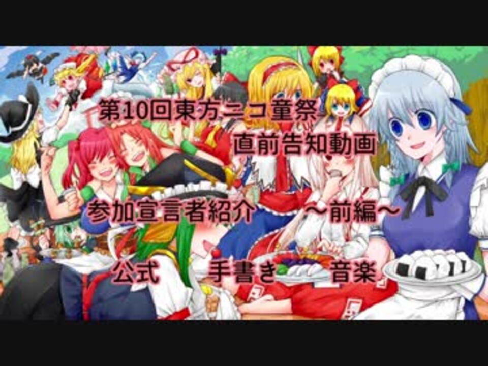 皆様大変、お待たせいたしました。第10回東方ニコ童祭、直前告知動画となります。<br />各企画の紹介と参加宣言をして下さった大勢の方々を御紹介させて頂きます!<br /><br />こちらの動画は、全参加宣言者紹介の前編となります。<br />後編も御座いますので、そちらも是非ご覧下さい。<br /><br /><font size="4" color="#0000ff">参加宣言紹介:後編→【<a href="https://www.nicovideo.jp/watch/sm33494090" class="watch">sm33494090</a>】</font><br />【企画名】第10回東方ニコ童祭<br />【催事内容】東方Projectオンリー動画投稿祭<br />【開催期間】2018年7月13日(金) 21時00分 ~ 7月16日(月・祝) 24時00分<br /><br />【東方ニコ童祭公式サイト】<a href="https://nicodosai.com/" target="_blank" rel="noopener nofollow">https://nicodosai.com/</a><br />【第10回特設ページ】<a href="http://nicodosai.com/10th/" target="_blank" rel="noopener nofollow">http://nicodosai.com/10th/</a><br /><br />【参加宣言】<a href="http://nicodosai.com/10th/join/what" target="_blank" rel="noopener nofollow">http://nicodosai.com/10th/join/what</a><br />【ED絵募集】<a href="http://nicodosai.com/10th/event/ed" target="_blank" rel="noopener nofollow">http://nicodosai.com/10th/event/ed</a><br /><br />【告知のお願い】<a href="http://nicodosai.com/10th/event/notice" target="_blank" rel="noopener nofollow">http://nicodosai.com/10th/event/notice</a><br /><br />開催告知動画→<a href="https://www.nicovideo.jp/watch/sm33163333" class="watch">sm33163333</a><br />第2回告知動画【企画紹介】→<a href="https://www.nicovideo.jp/watch/sm33290520" class="watch">sm33290520</a><br />第2回告知動画【早期参加宣言紹介】→<a href="https://www.nicovideo.jp/watch/sm33304472" class="watch">sm33304472</a><br /><br />コミュニティ:co287151<br />Twitter:@nicodosai<br />マイリスト:<a href="https://www.nicovideo.jp/mylist/44023992" target="_blank" rel="noopener">mylist/44023992</a>