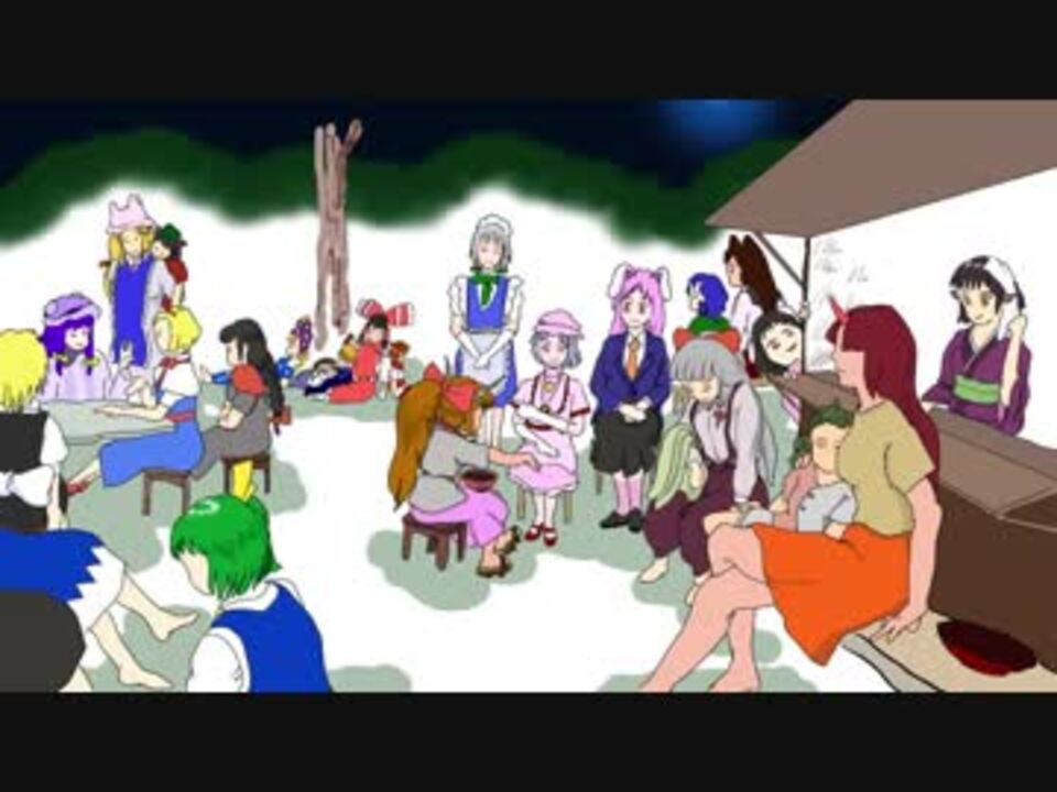 ニコ童祭りと時期が重なりそうだったので、いっその事、参加動画にしてみました。<br>当初考えていた守矢絡みの話が頓挫したため 、前の動画で頂いたコメントから<br>話をふくらませた、宴会がらみの話となっております。<br> いやでも膨らませすぎたかも。17分とか予想外でした。セリフ表示長さなど<br>調整しきれてない部分も多々あるかと思いますが、見てくだされば幸いです。<br>追記: 赤字と字が小さい所が見づらいようですね。申し訳ないです。 24point未満は避けます。<br> タグ手描き→手書き変更しました。 追加感謝です。<br>色々なコメント、うれしいです。喜んだり参考にしたりしてます。<br>ニコ童祭紹介動画:旅人ゆっくり様 <a href="https://www.nicovideo.jp/watch/sm33595498" class="watch">sm33595498</a>、まーき様 <a href="https://www.nicovideo.jp/watch/sm33597409" class="watch">sm33597409</a>、サンタクス様 <a href="https://www.nicovideo.jp/watch/sm33611239" class="watch">sm33611239</a><br>にて、紹介頂いています。 面映ゆい~。でもすごく嬉しいです。 <br><br>水炬様、アクリル様、とたけけ様、スザンヌろく丁目様、しんせい様、まーき様、二ノ瀬泰徳様、<br>くろすけ様、デスラー様、ちがいます様、ヤクソー様、鰹の獅子様、もこ沙様、ぽんす様、<br>zaqne様、らみー様、kidehira様、筒井式様、広告ありがとうございます。 <br><br>わかさぎ姫のif <a href="https://seiga.nicovideo.jp/seiga/im8314668" target="_blank" rel="noopener">im8314668</a><br><br><br><br>