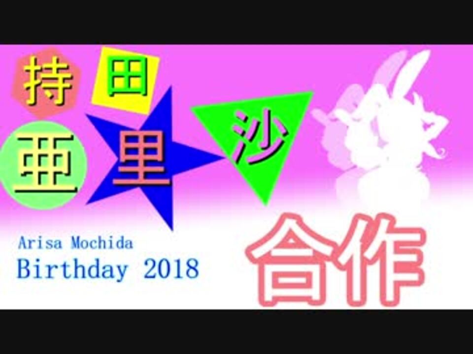 様8月24日って何の日か知っていますか? <br /><font color="#ff0000" size="4">持田亜里沙さんのおたんじょうびです!</font><br /><br />というわけで持田亜里沙さんを祝うために10数名の方が集まりました 。<br />知らない方はこの機会に興味をもってもらえたら嬉しいです<br />これからも持田亜里沙さんをよろしくお願いします!<br /><br /><font color="#ff0000" size="5">亜里沙さんお誕生日おめでとう!</font><br />制作に協力していただいた各方面の方々ありがとうございました<br /><br />※なおこの動画は後編に自動で飛びますので、眼に休憩をいれつつお楽しみください<br /><font size="4">後編<br /><a href="https://www.nicovideo.jp/watch/sm33734622" class="watch">sm33734622</a> </font><br /><br />追記<br />広告コメント等皆様ありがとうございます!<br /><br /><参加者><br />あずまの父ちゃん、もちきんちゃく、木下地下、<br />闇の魔神zawa缶、すrむこぬ、みがさか、<br />JOJO、FlickShot、左曲がり、ティッシュの箱、<br />ピコかめ、おっP、むつ睦夫、クロメテウス<br /><br />