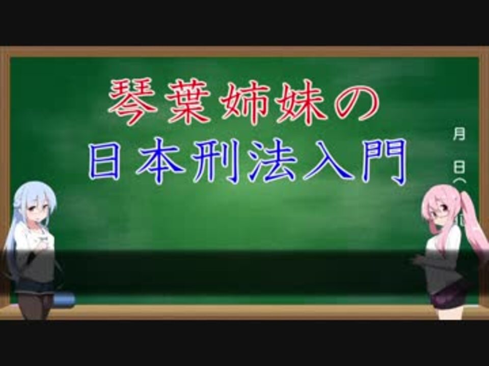低燃費動画の為表情差分は使用しておりません<br>刑法にはこんな事が書いてありますよ、程度の柔らかい内容です<br><br>全部で1遍13章、2遍40章あり<br>今回は1遍1章『総則』です<br><br>無し ←前 <a href="https://www.nicovideo.jp/mylist/63277391" target="_blank" rel="noopener">mylist/63277391</a> 次→ <a href="https://www.nicovideo.jp/watch/sm38159245" class="watch">sm38159245</a><br><br>その他制作物 <a href="https://www.nicovideo.jp/mylist/59494315" target="_blank" rel="noopener">mylist/59494315</a><br><br>~使用させていただいた素材~<br>琴葉姉妹立ち絵(zip様) <a href="https://seiga.nicovideo.jp/seiga/im7771414" target="_blank" rel="noopener">im7771414</a><br>黒板854x480(hone様) <a href="https://commons.nicovideo.jp/works/nc71896" target="_blank" rel="noopener">nc71896</a><br>台詞枠(黑もや)(インギンブレイ様) <a href="https://commons.nicovideo.jp/works/nc20115" target="_blank" rel="noopener">nc20115</a><br>見渡す街へ(魔王魂様) <a href="https://maoudamashii.jokersounds.com/list/bgm4.html" target="_blank" rel="noopener nofollow">https://maoudamashii.jokersounds.com/list/bgm4.html</a><br><br>※正直まだ面白味は無いけど次からほぇ~ポイント増えると思う