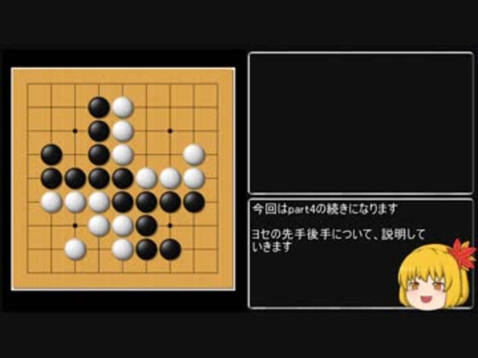 part4(<a href="https://www.nicovideo.jp/watch/sm33647420" class="watch">sm33647420</a>)の続きになります<br />ヨセの基本はひとまずおしまいです<br /><br />囲碁入門~初心者向けです <br />難易度に関しては入門~中級くらいを前後するのでLevelで見分けてくれると助かります <br /><br />Level 1~5 入門者~初心者向け <br />Level 3~7 初心者~中級者向け <br />Level 6~10 中級者向け<br /><br /><a href="https://www.nicovideo.jp/watch/sm33647420" class="watch">sm33647420</a>←Prev Next→<a href="https://www.nicovideo.jp/watch/sm33840705" class="watch">sm33840705</a><br /><br />ひとくち囲碁講座シリーズ:<a href="https://www.nicovideo.jp/mylist/62447768" target="_blank" rel="noopener">mylist/62447768</a><br />囲碁淫夢動画:<a href="https://www.nicovideo.jp/mylist/58666774" target="_blank" rel="noopener">mylist/58666774</a><br />単発囲碁動画:<a href="https://www.nicovideo.jp/mylist/60920267" target="_blank" rel="noopener">mylist/60920267</a><br />twitter @yamashinzyu<br />
