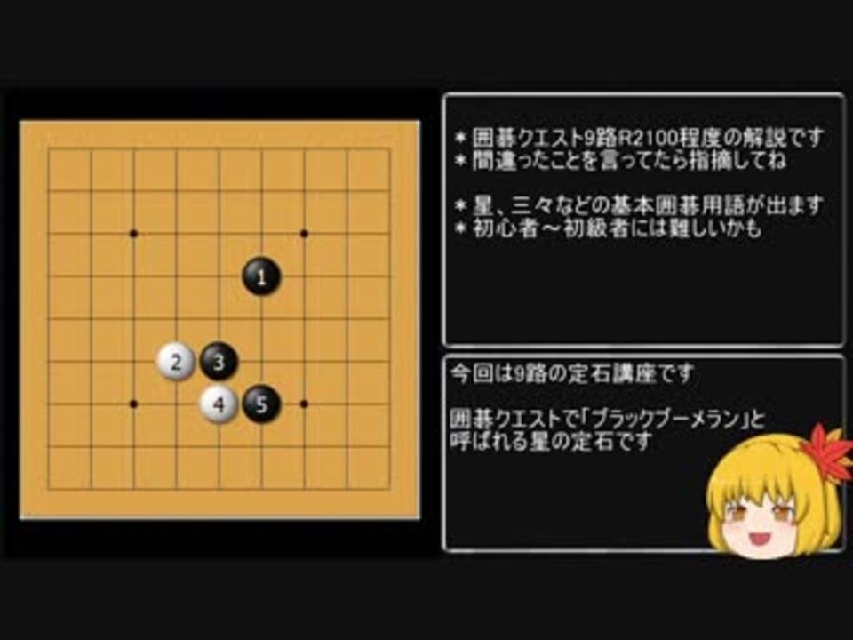 9路定石、ブラックブーメランの解説です。<br>名前オシャレでかっこいいよね。<br><br>囲碁中級者向けです <br>難易度に関しては入門~中級くらいを前後するのでLevelで見分けてくれると助かります <br><br>Level 1~5 入門者~初心者向け <br>Level 3~7 初心者~中級者向け <br>Level 6~10 中級者向け<br><br><a href="https://www.nicovideo.jp/watch/sm33840705" class="watch">sm33840705</a>←Prev Next→<a href="https://www.nicovideo.jp/watch/sm34090471" class="watch">sm34090471</a><br><br>ひとくち囲碁講座シリーズ:<a href="https://www.nicovideo.jp/mylist/62447768" target="_blank" rel="noopener">mylist/62447768</a><br>囲碁淫夢動画:<a href="https://www.nicovideo.jp/mylist/58666774" target="_blank" rel="noopener">mylist/58666774</a><br>単発囲碁動画:<a href="https://www.nicovideo.jp/mylist/60920267" target="_blank" rel="noopener">mylist/60920267</a><br><br>20181002追記:Levelを8から10に変更しました
