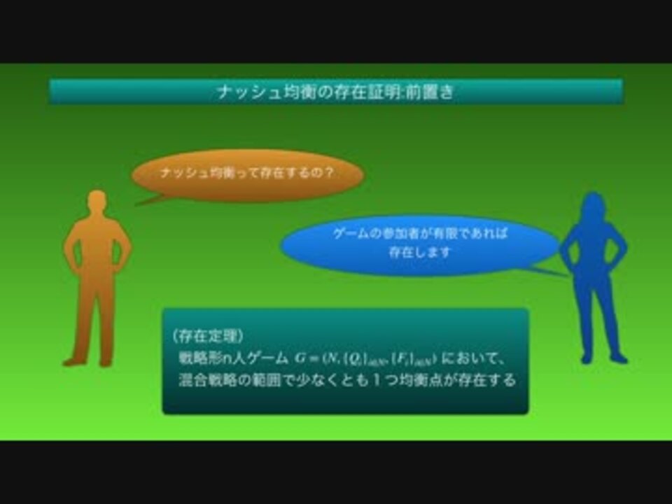 動画視聴の皆様<br><br>たいへんお世話になっております。S.Kと申します。<br>第1回:<a href="https://www.nicovideo.jp/watch/sm33088378" class="watch">sm33088378</a> ナッシュ均衡<br>第2回:<a href="https://www.nicovideo.jp/watch/sm33118075" class="watch">sm33118075</a> 混合戦略<br>での<strong>補足動画</strong>となります。<br><br>次回:<a href="https://www.nicovideo.jp/watch/sm34151019" class="watch">sm34151019</a><br><br>UP主の小言:<br>ナッシュ均衡の存在証明動画シリーズ。先は長い。<br>「困難は分割せよ」<br><br />---共通説明文---<br><span style="color: #262626;">◆note</span><br><a href="https://note.com/sk_game_theory/n/n1d7d815f1635" target="_blank" rel="noopener nofollow">https://note.com/sk_game_theory/n/n1d7d815f1635</a><br>◆スライドシェア<br><a href="https://www.slideshare.net/ssusere0a682" target="_blank" rel="noopener nofollow">https://www.slideshare.net/ssusere0a682</a><br>◆シリーズ<br>BASIC演習:<a href="https://www.nicovideo.jp/series/247538" target="_blank" rel="noopener">series/247538</a><br><span style="color: #ff9900;">BASIC:<a href="https://www.nicovideo.jp/series/194848" target="_blank" rel="noopener">series/194848</a></span><br><span style="color: #980000;">Re:ゲーム理論入門:<a href="https://www.nicovideo.jp/series/40558" target="_blank" rel="noopener">series/40558</a><br>Re:ゲーム理論応用:<a href="https://www.nicovideo.jp/series/49708" target="_blank" rel="noopener">series/49708</a><br>Re:ゲーム理論演習:<a href="https://www.nicovideo.jp/series/49754" target="_blank" rel="noopener">series/49754</a><br>NEXTコア:<a href="https://www.nicovideo.jp/series/167179" target="_blank" rel="noopener">series/167179</a><br>NEXT線形計画問題:<a href="https://www.nicovideo.jp/series/169349" target="_blank" rel="noopener">series/169349</a></span><br><span style="color: #ff0000;">NEXT戦略形協力ゲーム:<a href="https://www.nicovideo.jp/series/176133" target="_blank" rel="noopener">series/176133</a><br>ゲーム理論A/E:<a href="https://www.nicovideo.jp/series/179360" target="_blank" rel="noopener">series/179360</a></span><br><span style="color: #980000; font-size: 13px;">ナッシュ均衡証明(角谷不動点定理):<a href="https://www.nicovideo.jp/series/49713" target="_blank" rel="noopener">series/49713</a><br>ゲーム理論とプログラミング:</span><span style="color: #980000;"><a href="https://www.nicovideo.jp/series/49716" target="_blank" rel="noopener">series/49716</a></span><br><br>BGM:Purple Planet Royalty Free Music <br><a href="http://www.purple-planet.com/" target="_blank" rel="noopener nofollow">http://www.purple-planet.com/</a> <br><br><span style="color: #0000ff;">ゲーム論コミュ: co226157 <br>作業コミュ: co1037572</span><br>◆お問合せはこちら<br><span style="color: #0000ff;">Twitter: @SK1225GT <br>Youtube:<a href="https://www.youtube.com/channel/UCEr2VZ6DI4gATRtVJw49ZFw" target="_blank" rel="noopener nofollow">https://www.youtube.com/channel/UCEr2VZ6DI4gATRtVJw49ZFw</a></span><br>