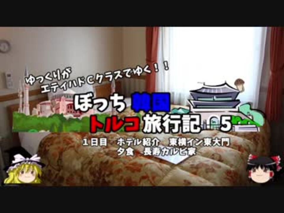 <font color="#ff0000" size="4"><u>※Youtubeで1話分、先行配信中 </u></font><br><font color="#0000ff" size="4"> <a href="http://www.youtube.com/c/なめこのぼっち旅" target="_blank" rel="noopener nofollow">http://www.youtube.com/c/なめこのぼっち旅</a></font> <br><br><b> </b>今回は韓国で利用したホテルの紹介と、<br>明洞で食べた韓国料理の焼肉紹介です。<br><br>第1話→<a href="https://www.nicovideo.jp/watch/sm34047420" class="watch">sm34047420</a><br><br>第1章・・・韓国観光編<font color="#ff0000">←今ココ</font><br> 第2章・・・出発編<br> 第3章・・・トルコ観光編<br> 第4章・・・帰路編<br><br><font color="#ff0000">コミュニティー→co2910020</font><br> twitter→<a href="https://twitter.com/ryontan" target="_blank" rel="noopener nofollow">https://twitter.com/ryontan</a><br><br><a href="https://www.nicovideo.jp/watch/sm34104050" class="watch">sm34104050</a>←前回 <font color="#ff0000">次回 6話→<a href="https://www.nicovideo.jp/watch/sm34139008" class="watch">sm34139008</a></font><br><br>解説・雑談系→<a href="https://www.nicovideo.jp/mylist/63171869" target="_blank" rel="noopener">mylist/63171869</a><br>今作 韓国トルコ旅行記→<a href="https://www.nicovideo.jp/mylist/63654428" target="_blank" rel="noopener">mylist/63654428</a><br>今作 車中泊旅行記→<a href="https://www.nicovideo.jp/mylist/54706524" target="_blank" rel="noopener">mylist/54706524</a><br>前作 久米島(沖縄)旅行記→<a href="https://www.nicovideo.jp/mylist/63059251" target="_blank" rel="noopener">mylist/63059251</a><br><b></b>イギリスタイ旅行記→<a href="https://www.nicovideo.jp/mylist/60044833" target="_blank" rel="noopener">mylist/60044833</a><br>クルーズ旅行記→<a href="https://www.nicovideo.jp/mylist/57397685" target="_blank" rel="noopener">mylist/57397685</a><br>ドイツ周遊記→<a href="https://www.nicovideo.jp/mylist/54938346" target="_blank" rel="noopener">mylist/54938346</a><br>北海道旅行記→<a href="https://www.nicovideo.jp/mylist/52618057" target="_blank" rel="noopener">mylist/52618057</a><br>アメリカ横断記→<a href="https://www.nicovideo.jp/mylist/48621785" target="_blank" rel="noopener">mylist/48621785</a><br>イタリア周遊記→<a href="https://www.nicovideo.jp/mylist/45763559" target="_blank" rel="noopener">mylist/45763559</a><br>NY旅行記→<a href="https://www.nicovideo.jp/mylist/44343854" target="_blank" rel="noopener">mylist/44343854</a><font color="#ff0000" size="5"><font color="#000000" size="2"><br></font></font>