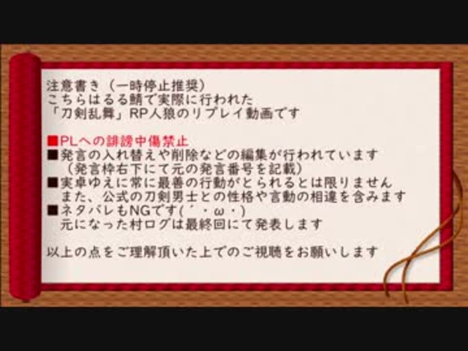 るる鯖で実際に行われた刀剣乱舞RP人狼のリプレイ動画です。<br>前 <a href="https://www.nicovideo.jp/watch/sm34154717" class="watch">sm34154717</a>(議論開始)<br>次 <a href="https://www.nicovideo.jp/watch/sm34278866" class="watch">sm34278866</a> <br>人狼動画マイリスト <a href="https://www.nicovideo.jp/mylist/63827134" target="_blank" rel="noopener">mylist/63827134</a> <br><br>追記:5分6秒辺りに追記。ご指摘ありがとうございました。<br>※11月25日 タイトルにちょっと追加<br><br>村立て予告の確認はこちらの掲示板でできます。<br>ttp://jbbs.shitaraba.net/netgame/14525/<br><br>■広告ありがとうございました!<br>ふじやまさん/もにゅさん/moniiさん/備前国審神者さん/しおりーなさん/(´・ω・) さん/備前国審神者さん/碧羅さん/なにぬまねのんさん/コウさん/そうへいさん/朱月桜華(しゅあん)さん/kirschさん/応援審神者さん/備後国の審神者さん/シキさん(同名略)<br><br />今までお借りしたBGM詳細 <a href="https://ch.nicovideo.jp/article/ar1793041" target="_blank" rel="noopener">ar1793041</a><br><br>村立て予告の確認はこちらの掲示板でできます。<br>ttp://jbbs.shitaraba.net/netgame/14525/<br><br>1村目 <a href="https://www.nicovideo.jp/watch/sm34154717" class="watch">sm34154717</a><br>2村目 <a href="https://www.nicovideo.jp/watch/sm34583834" class="watch">sm34583834</a><br>3村目 <a href="https://www.nicovideo.jp/watch/sm36031059" class="watch">sm36031059</a><br>4村目 <a href="https://www.nicovideo.jp/watch/sm37728354" class="watch">sm37728354</a><br>番外編1 <a href="https://www.nicovideo.jp/watch/sm35031050" class="watch">sm35031050</a><br>番外編2 <a href="https://www.nicovideo.jp/watch/sm36863775" class="watch">sm36863775</a>
