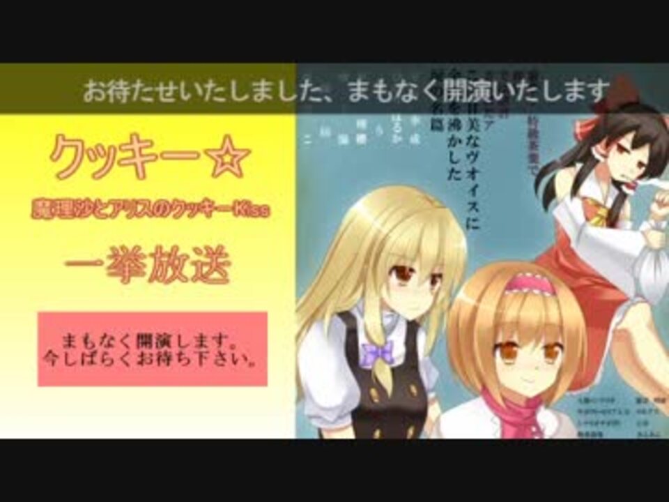 1919/08/10(日) 01:14開場 05:14開演 タイムシフト予約する ニコニコ生放送では、8月10日(日)より、<font color="red">「クッキー☆」</font>の振り返り一挙放送を行います。<br><b>放送スケジュール</b><br>クッキー☆:【東方合同動画企画】魔理沙とアリスのクッキーKiss<br>クッキー☆☆1期:【MMD】東方お正月!ボイスドラマ企画<br>クッキー☆☆2期:【MMD】東方お正月!ボイスドラマ企画<br>クッキー☆☆3期:【MMD】東方クリスマス!ボイスドラマ企画 2013【画質向上版】<br>SWK is GOD:早苗といっしょにトレーニング【声優さん付き】<br>クッキー☆☆☆<br>ハロウィン☆:【東方ボイスドラマ】The Witch's Happy Halloween_<br>鍋☆:【東方ボイスドラマ】古明地こいしのドキドキ☆鍋パーティ!<br>【東方ボイスドラマ】東風谷早苗の命蓮寺大冒険~What day is today?~<br>休憩<br>ピーナッツ☆:東方夏休み ヴォイスドラマ企画<br>【東方ボイスドラマ】こいしとこころのハッピークリスマス<br>クッソー☆1期:東方クリスマス2015!ボイスドラマ企画<br>クッソー☆2期:【東方ボイスドラマ】the reimu's happy holidays<br>クッソー☆3期:【ボイスドラマ】霊夢と魔理沙のチョコレート★ハート<br>クッソー☆4期:東方クリスマス2015!ボイスドラマ企画<br>クッソー☆5期:【クッソー☆】霊夢と魔理沙のチョコ咀嚼☆口移しチャレンジ<br>【東方二次創作】出会いは空から降ってはこない type A【ボイスドラマ】<br>【東方二次創作】出会いは空から降ってはこない type B【ボイスドラマ】<br>【東方】魔理沙の苦悩【ボイスドラマ】<br>☆放送スケジュールは予告なく変更となる場合がございます。予めご了承下さい。使った画像はこれです→<a href="https://seiga.nicovideo.jp/seiga/im5227271" target="_blank" rel="noopener">im5227271</a>