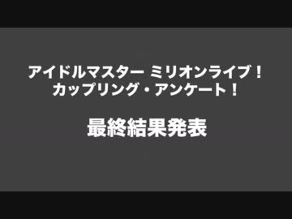 【注意】 カップリングの順位付けや特定のカップリングが苦手な方は視聴をオススメしません。<br><br>この動画は非公式のカップリング人気投票企画<br><br><span style="color: #ff9900; font-size: 18px;"><strong>アイドルマスター ミリオンライブ!<br> カップリング・アンケート!<br><br> 最終結果発表</strong></span><br><br>の動画です。<br><br><span style="color: #ff0000; font-size: 18px;"><strong>総カップリング数333種類!</strong></span><br><br>企画にご協力いただいた皆様、本当にありがとうございました。<br><br><span style="color: #0000ff;">※男女別の順位も紹介していますが、回答者数的に信頼性は低いので参考までと思ってください。</span><br><br>【51位以下】<br><a href="http://ch.nicovideo.jp/millioncp_enquete/blomaga/ar1702448#-" target="_blank" rel="noopener nofollow">http://ch.nicovideo.jp/millioncp_enquete/blomaga/ar1702448#-</a><br><br>【データ紹介】<br><a href="http://ch.nicovideo.jp/millioncp_enquete/blomaga/ar1702410#-" target="_blank" rel="noopener nofollow">http://ch.nicovideo.jp/millioncp_enquete/blomaga/ar1702410#-</a><br><br>※キャラ別のカップリング数も紹介してます。<br><br>【Twitter】<br><a href="https://twitter.com/milioncp" target="_blank" rel="noopener nofollow">https://twitter.com/milioncp</a>