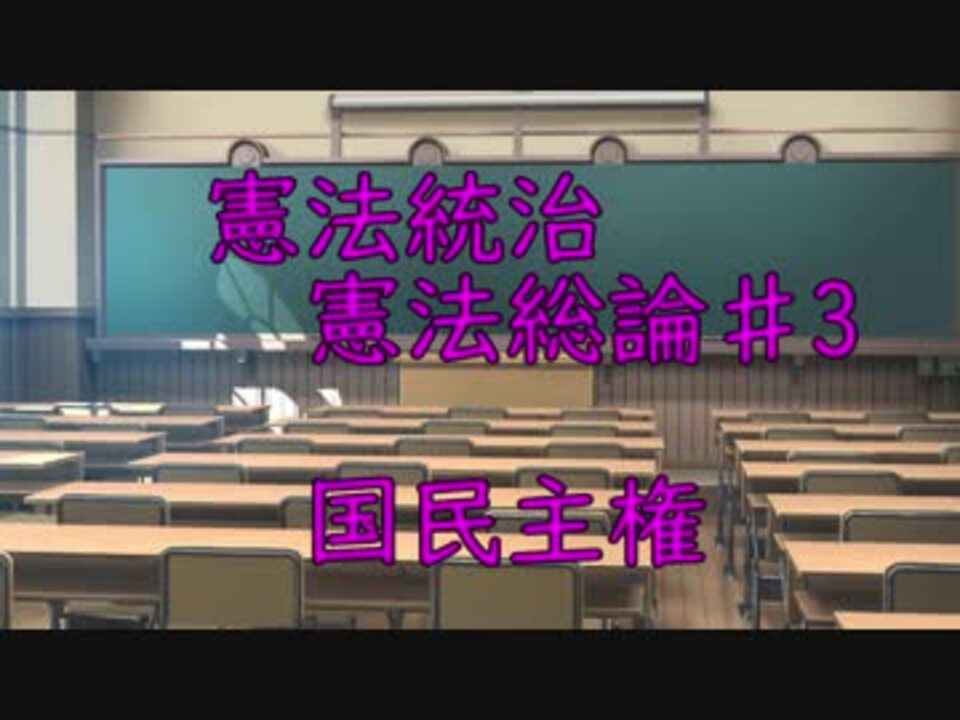 <font color="#111111">憲法統治シリーズ第3回めの動画を投稿いたします!<br><br>今回は、<b>国民主権</b>を少しだけ詳しく掘り下げたり、<b>憲法前文</b>の構造をちょっとだけ学んだり、ですね。 <br>その中で、併せて<b>法規範性</b>・<b>裁判規範性</b>という概念や、<b>ナシオン主権</b>・<b>プープル主権</b>という概念について簡単に見ております。今回は、こんな感じの内容です!<br><br></font><font color="#111111">※皆が楽しめる動画にしたいので、</font><font color="red"><b>コメントでの政治的意見表明、公人・私人を問わず特定人への誹謗中傷等はご遠慮ください</b></font><font color="#111111">。<br><br></font>前:<a href="https://www.nicovideo.jp/watch/sm34245647" class="watch">sm34245647</a><br><font color="#111111">次:<a href="https://www.nicovideo.jp/watch/sm34310136" class="watch">sm34310136</a><br><br>【追記】「トコトコ」さん、「民主 きらめ」さん、「ぶーこ」さん、「バイキンマン」さん、「プルギさん」さん、「よこはま」さん、ニコニ広告有難うございます!!<br></font><font color="#111111"><br></font><br /><font color="#111111">【憲法統治動画シリーズ】</font> <font color="#0080ff"><a href="https://www.nicovideo.jp/mylist/63933510" target="_blank" rel="noopener">mylist/63933510</a></font><font color="#111111"><br>