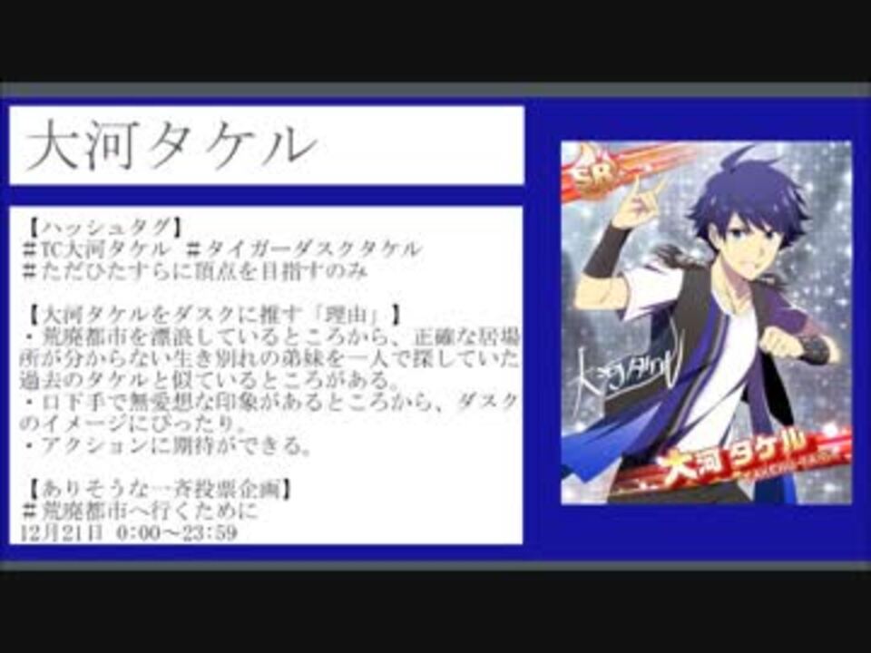 投稿が予定より遅れてしまい申し訳ございません・・・!リアル多忙や、元々当動画の人数が他より多めなこともあり・・・。 ですが、その分内容は濃い目のSideMTCシリーズ第3弾にして最終作です。<br><br>他シリーズはこちら! <br>孤島サスペンスホラー編【<a href="https://www.nicovideo.jp/watch/sm34486116" class="watch">sm34486116</a>】<br>おとぎの国の物語編【<a href="https://www.nicovideo.jp/watch/sm34495628" class="watch">sm34495628</a>】<br><br>当動画登場アイドルでは旬とタケル担当なので、おそらくアマリリジュンとタイガーダスクタケルを推してましたが、これまた全員見たい・・・。近未来アウトサイダーではバスブレ紗代子とエミリリスを支援していました。紗代子は2位に終わりましたが、彼女や彼女のP達の最後まで諦めない心はとても素晴らしかったと思います。たった1票でも投票というワードは強い。エミリーは元々ごヒイキ様なこともあって支援していました。おめでとう・・・。<br>【1/27追記】たくさんのコメントありがとうございます!ご希望を多数いただいているので申し上げますと、残念ながらTA・TB動画を作る予定は今のところありません。理由としては①TA・TBは既に楽曲として完成している・出演アイドルが決まっているので、どうしてもそこから当てはめて考えてしまうため表現の幅が減る。②私自身TA・TBをリアタイで追えていないため、タグや一斉企画を考えるのが大変。その結果、③TC動画はリアタイで行われていてまだ登場アイドルが未定だったからこそ作れたものであり、TA・TBでも同じクオリティの動画をお届けできる自信がない。 ということになります。ご期待に応えられず申し訳ございません。もしよろしければですが、私が過去に投稿した私の中のTBを形にした越境動画があるので、そちらの方もご視聴いただけましたら幸いです。 →315プロアイドルに他事務所の曲を歌ってほしい【<a href="https://www.nicovideo.jp/watch/sm34391873" class="watch">sm34391873</a>】 <br><br>Twitter→@madoka_asuran<br>うp主のTwitterモーメントリンク→<a href="https://twitter.com/i/moments/1088592642194190336" target="_blank" rel="noopener nofollow">https://twitter.com/i/moments/1088592642194190336</a> <br>(本当はブロマガで書きたかったんですけどうp主はケチなのでプレミアム会員ではなかったのでした。ケチですまーん!!)<br>