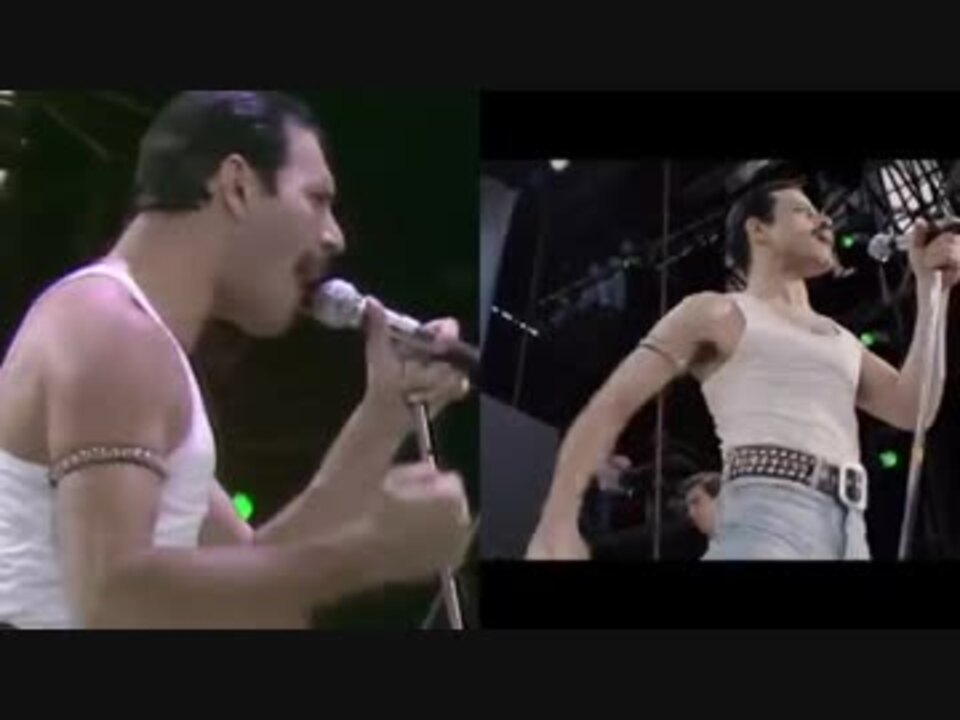 日本で100億円超を売上げ,2018年本邦公開のナンバーワンとなった映画 Bohemian Rhapsody<br>フィナーレに使われたライブ映像と,オリジナルのクイーン動画との並列比較 改良版です。<br> Radio GaGaと Hammer To Fall の2曲はフルレングスとはなっていませんが,本編ではカットされてしまった後半の2曲(Crazy Little Thing Called Love,We Will Rock You) を含んでいます。<br><br> 1985年7月13日 旧 Wembley stadiumで行われたアフリカ飢餓救済チャリティ Live Aidにおいて<br>圧巻のパフォーマンスを披露し解散の噂や人気低下の評を完全払拭したクイーン。<br>このギグでの圧倒的MVPと評され,同日のヘッドライナーを務めたエルトン・ジョンがそのあまりの出来栄えと会場との一体感にバックステージで地団駄を踏んだという,クイーン伝説の21分間。<br> 映画でのライブシーンはこの演奏の一部の再現ですが 渾身のステージです。 つべからの転載。<br><br> またこの時にクイーンに嫉妬し悔しがったエルトンが,7年後のフレディ追悼コンサートではあのアクセル・ローズと一緒に Bohemian Rhapsody を歌いあげたというのも感慨深いものがあります。<br><br> 初回 投稿版 → <a href="https://www.nicovideo.jp/watch/sm34583397" class="watch">sm34583397</a><br> その3完全版 → <a href="https://www.nicovideo.jp/watch/sm34728709" class="watch">sm34728709</a> <br>オープニング,ベストシーン,エンドクレジット → <a href="https://www.nicovideo.jp/watch/sm34945689" class="watch">sm34945689</a> ・・・<strong>New!</strong><br><br><br> 00:00 - Introduction to Queen in LIVE AID concert<br> 01:44 - LIVE AID Concert starts<br> 02:26 - Bohemian Rhapsody<br> 04:44 - Radio GaGa<br> 07:25 - Ay Oh!<br> 08:04 - Hammer to Fall<br> 10:47 - Crazy Little Thing Called Love <br> 14:49 - We Will Rock You<br> 16:05 - We Are The Champions