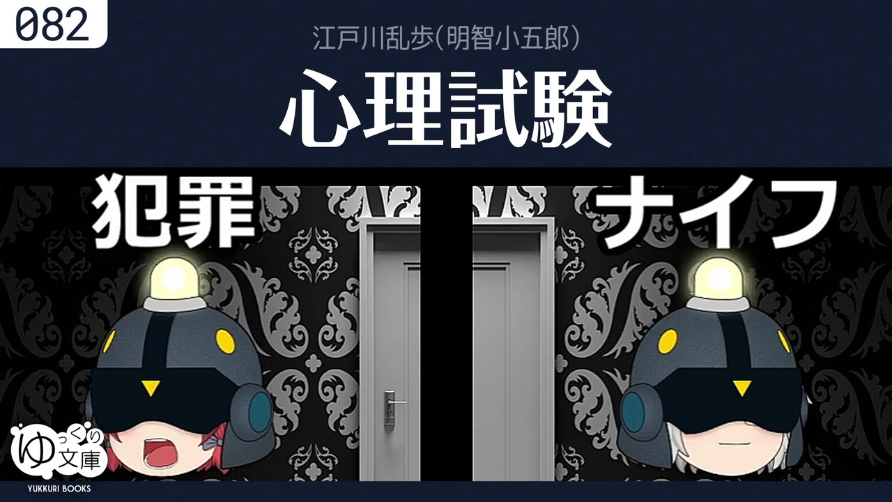 <span style="color: red;"><strong>082 心理学に通じた犯人──</strong></span><br>蕗屋清一郎は高利貸しのババアを殺し、カネを奪った。彼はいかにして犯行を思いつき、実行し、隠蔽し、警察の捜査をかいくぐったか?<br><br><span style="color: green;">The Psychological Test (1925) by Edogawa Ranpo</span><br><br>(うp主より)犯人視点のミステリー。<br>編集後記:<a href="http://trynext.com/story/ybook/yb082.php" target="_blank" rel="noopener nofollow">http://trynext.com/story/ybook/yb082.php</a><br><br>●乱歩と横溝<br><a href="https://www.nicovideo.jp/watch/sm32629937" class="watch">sm32629937</a> 横溝正史「犬神家の一族」(全3話+PV)<br><a href="https://www.nicovideo.jp/watch/sm34502341" class="watch">sm34502341</a> 横溝正史「百日紅の下にて」<br><a href="https://www.nicovideo.jp/watch/sm34642963" class="watch">sm34642963</a> <span style="color: #ff00ff;"><strong>江戸川乱歩「心理試験」</strong></span><br><a href="https://www.nicovideo.jp/watch/sm34676360" class="watch">sm34676360</a> 江戸川乱歩「双生児 -ある死刑囚が教誨師にうちあけた話-」<br><a href="https://www.nicovideo.jp/watch/sm37642159" class="watch">sm37642159</a> 江戸川乱歩「屋根裏の散歩者」<br>(関連)ゆっくり横溝正史 <a href="https://www.nicovideo.jp/mylist/64249566" target="_blank" rel="noopener">mylist/64249566</a><br><br>●ゆっくり文庫について<br>全部:<a href="https://www.nicovideo.jp/mylist/74874627" target="_blank" rel="noopener">mylist/74874627</a><br>近況:<a href="https://twitter.com/trynext" target="_blank" rel="noopener nofollow">https://twitter.com/trynext</a><br>---<br>(訂正)<br><a href="#" class="seekTime" data-seekTime="05:58" onclick="seekNicoPlayer('#05:58'); return false;">#05:58</a> 5,230円は現在の価値で、約200万 → 約700万<br><br>