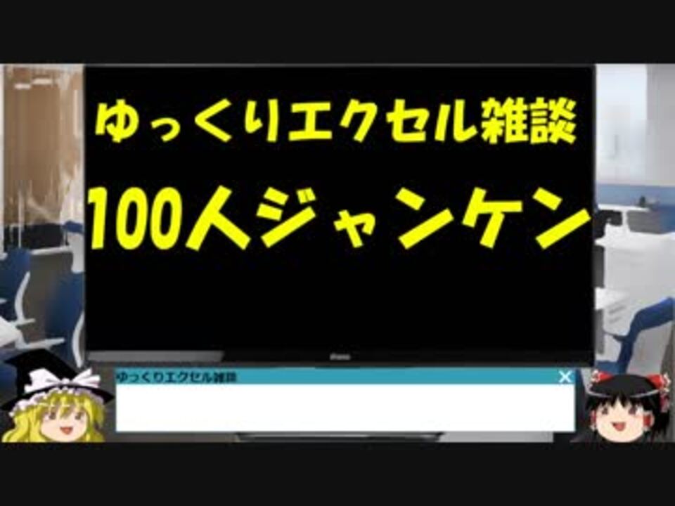 視聴者からの挑戦状!?<br>100人ジャンケンにVBAを使わずに対応しました!<br><br>色々な関数や技を使っていますので、参考にドウゾ!<br><br><span style="color: #202124; font-size: 13px;"><a href="https://www.nicovideo.jp/watch/sm34646790" class="watch">sm34646790</a></span>←前||後→<a href="https://www.nicovideo.jp/watch/sm34677902" class="watch">sm34677902</a><br><br />現場で培った経験を元にエクセルあるあるネタを入れつつ<br>仕事に役立つ情報を提供!<br><br><strong>YOUTUBE版</strong><br><a href="https://www.youtube.com/watch?v=xfsl3ziD1ag" target="_blank" rel="noopener nofollow">https://www.youtube.com/watch?v=xfsl3ziD1ag</a><br><span style="font-size: 13px;"><strong>マイリスト(</strong></span><span style="font-size: 13px;"><a href="https://www.nicovideo.jp/mylist/64075136" target="_blank" rel="noopener">mylist/64075136</a></span><span style="font-size: 13px;"><strong>)入門編(</strong></span><span style="font-size: 13px;"><a href="https://www.nicovideo.jp/mylist/64390581" target="_blank" rel="noopener">mylist/64390581</a></span><span style="font-size: 13px;"><strong>)VBA編(</strong></span><a href="https://www.nicovideo.jp/mylist/64204466" target="_blank" rel="noopener">mylist/64204466</a>)<br><span style="font-size: 13px;"><strong>Access編(</strong></span><a href="https://www.nicovideo.jp/mylist/64875641" target="_blank" rel="noopener">mylist/64875641</a><span style="font-size: 13px;"><strong>)<br>Twitter(</strong></span><a href="https://twitter.com/MHTUpQbYQwatGFb" target="_blank" rel="noopener nofollow">https://twitter.com/MHTUpQbYQwatGFb</a><span style="font-size: 13px;"><strong>)</strong></span><br><br>使用ソフト<br>AviUtl :<a href="http://spring-fragrance.mints.ne.jp/a..." target="_blank" rel="noopener nofollow">http://spring-fragrance.mints.ne.jp/a...</a><br>ゆっくりMovieMaker3/ 4 :<a href="https://manjubox.net/ymm3/" target="_blank" rel="noopener nofollow">https://manjubox.net/ymm3/</a><br>OBS Studio :<a href="https://obsproject.com/ja/download" target="_blank" rel="noopener nofollow">https://obsproject.com/ja/download</a><br>Office365 :<a href="https://amzn.to/2LcO9Md" target="_blank" rel="noopener nofollow">https://amzn.to/2LcO9Md</a>