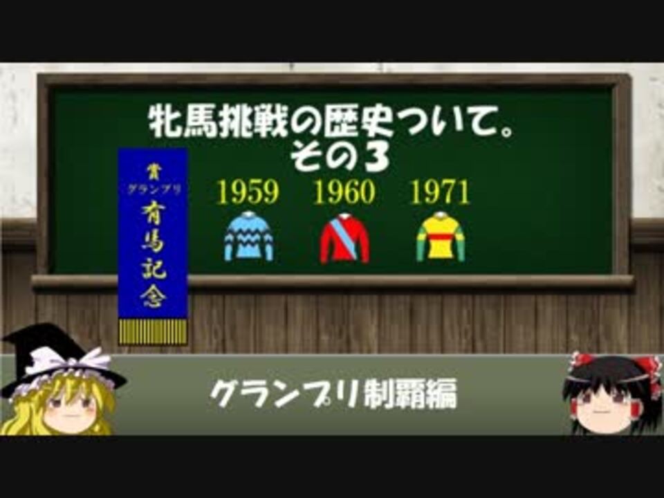 前作<a href="https://www.nicovideo.jp/watch/sm34589935" class="watch">sm34589935</a> 次作<a href="https://www.nicovideo.jp/watch/sm34726366" class="watch">sm34726366</a> <span style="color: #000000; font-size: 14px;">牝馬シリーズマイリス<a href="https://www.nicovideo.jp/mylist/65869255" target="_blank" rel="noopener">mylist/65869255</a> 競馬解説マイリス</span><span style="color: #006699; font-size: 14px;"><a href="https://www.nicovideo.jp/mylist/64207040" target="_blank" rel="noopener">mylist/64207040</a></span><br><br>つべ <a href="https://www.youtube.com/watch?v=aJ5OSJ0aRoE" target="_blank" rel="noopener nofollow">https://www.youtube.com/watch?v=aJ5OSJ0aRoE</a><br><br><br>競馬の牝馬挑戦の歴史について解説してみました。<br><br>今回は1954年~トウメイを年代を追いながらの紹介。<br><br>有馬、宝塚の両グランプリも始まります。必見のガーネツトの第4回有馬記念の映像は<a href="https://www.nicovideo.jp/watch/sm17333460" class="watch">sm17333460</a><br>現役時代や繁殖成績以外にもエピソードが盛沢山の馬ばかりなのですが、この動画では成績中心に紹介してます。<br>詳しくは皆さん調べて見てくださいね(;^ω^)<br><br>個人のにわか知識がベースなので、間違いがあっても許して下さい。<br>何でもするとは言いません。<br><br>登場馬:オパールオーキツト、セルローズ、ガーネツト、スターロツチ、クリヒデ、トースト、エイトクラウン、トウメイ<br><br><br>BGM:甘茶の音楽工房様<br>画像提供元: TURF☆DUST 様 うまぽっと様<br>参考HP:優駿達の蹄跡様 Wikipedia