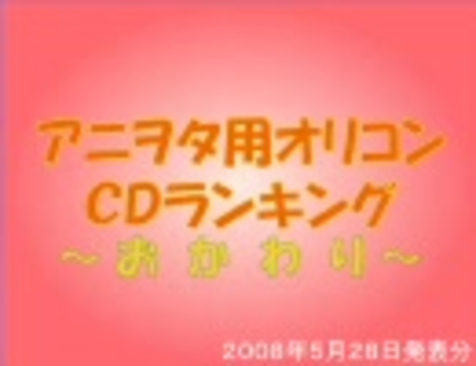 08/05/28発表の<b>オリコンCDウィークリーチャートBEST100</b>よりヲタ向けの楽曲中心にピックアップ。<br />【前週:<a href="https://www.nicovideo.jp/watch/sm3392055" class="watch">sm3392055</a>】【マイリスト兼製作本部<a href="http://blog.livedoor.jp/uui0822/】【本家マイリスト:mylist/1891161】" target="_blank" rel="noopener nofollow">http://blog.livedoor.jp/uui0822/】【本家マイリスト:mylist/1891161】</a><br /> <font size="2",font color="1e90ff">【101~:<a href="https://www.nicovideo.jp/watch/sm3491011" class="watch">sm3491011</a>】</font>←DVD効果炸裂!<br /> <font size="2",font color="f4a460">【コミックTOP30:<a href="https://www.nicovideo.jp/watch/nm3481319" class="watch">nm3481319</a>】</font>←凄く・・・ハルヒ読みたいです・・・<br />情緒不安定で動画作った結果がこれだよ!ダメダコリャorz<br /><b>OPの元ネタ→<a href="https://www.nicovideo.jp/watch/sm3371633" class="watch">sm3371633</a></b><br />【】【エコノミー対応版:今週はお休みです】【翌週:<a href="https://www.nicovideo.jp/watch/sm3557372" class="watch">sm3557372</a>】<br /><b><font color="ff0000">注意:ウマウマシングルはアニメ要素皆無なので該当外、5/28発売のCDは来週ランクイン予定。</font></b>