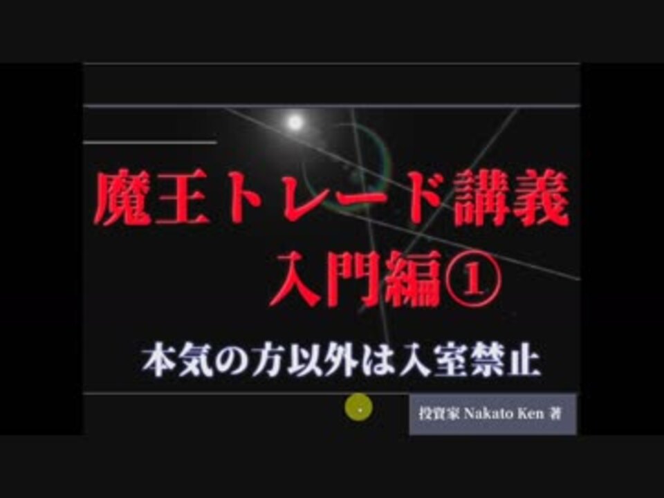 投資家 長門研 (Nagato Lab) の魔王トレード講義の入門編①です。<br><br>魔王トレードの本格的なテクニカル分析の解説やトレードの様子が知りたい方は、<br>今後投稿予定である中級編をご覧ください。<br>(動画収録の内容によって<span style="color: #000000;">は、一部限定配信や有料配信にするかもしれません)</span><br><br><br>FX実況者から投資の挑戦状(前編・後編)。この3問を直感的に理解できれば一流トレーダー<br><span style="color: #000000;"> :前編 ⇒ </span><a href="https://www.nicovideo.jp/watch/sm34261350" class="watch">sm34261350</a><br>FX実況者が1000万円を溶かしたときの数週間をいま振り返る(前編・後編)<br> :後編 ⇒ <a href="https://www.nicovideo.jp/watch/sm34236673" class="watch">sm34236673</a><br><span style="color: #000000;">一流投資家になるための魔王学講義。厳選3題で悪魔的視点を身につける<br> : ⇒ </span><a href="https://www.nicovideo.jp/watch/sm34685112" class="watch">sm34685112</a><br>本物トレーダーのNakatoが100万円で検証(シリーズ)<br> :Part5 ⇒ <a href="https://www.nicovideo.jp/watch/sm34575335" class="watch">sm34575335</a><br><br /><br>◇ Youtubeでの活動:<br>チャンネル登録で長門研の最新トレードをチェックできます<br>⇒<a href="http://www.youtube.com/channel/UCDsL1B6bahakTpZ7KTejJ4w?sub_confirmation=1" target="_blank" rel="noopener nofollow">http://www.youtube.com/channel/UCDsL1B6bahakTpZ7KTejJ4w?sub_confirmation=1</a><br><br>◇ 長門研 (Nagato Lab) のプロフィール:<br>理系のシステム系トレーダー。大学時代に伝説の投資サークルに所属し、中長期株を主体として資産を3~4倍にした経験をもつ。大学卒業後、株式投資・FX・先物・オプションなど、あらゆる相場の最新チャートパターンを独自に分析し、プロよりも圧倒的に稼げる『魔王トレード』の手法を開発。特に下落相場が得意で、利益の大半は下落相場によるものである。相場の急落中に一人だけ稼ぎまくるため、投資仲間からは「下落の虎」と呼ばれている。<br><br>魔王トレード(一部公開) <a href="https://www.nicovideo.jp/mylist/65068368" target="_blank" rel="noopener">mylist/65068368</a><br>投資の初心者向け講義 <a href="https://www.nicovideo.jp/mylist/63665765" target="_blank" rel="noopener">mylist/63665765</a><br>FX実況 <a href="https://www.nicovideo.jp/mylist/63665736" target="_blank" rel="noopener">mylist/63665736</a><br>投資家Nakatoが踊ってみた <a href="https://www.nicovideo.jp/mylist/63843321" target="_blank" rel="noopener">mylist/63843321</a> <br>講義紹介PV <a href="https://www.nicovideo.jp/mylist/63665757" target="_blank" rel="noopener">mylist/63665757</a> <br>