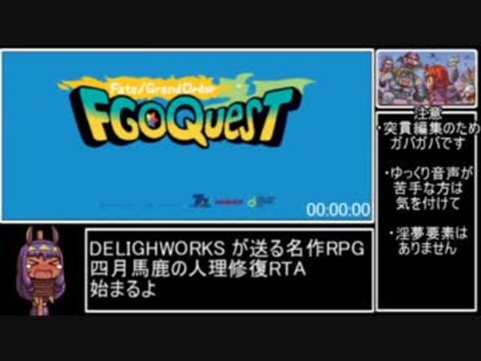 この動画は2019年4/1(月)に限定配信されたiOS、Andoroid向けアプリ<br>FGOQuestの<br><strong>魔王討伐までの</strong><br>時間を計測したRTAです。<br><br><strong>【計測ルール】</strong><br><span style="color: #ff0000;"><strong>計測開始:スタート画面で『ぼうけんする』から『あたらしくはじめる』を選んだ瞬間</strong></span><br><span style="color: #0000ff;"><strong>計測終了:魔王を倒したウインドウが映った瞬間</strong></span><br><span style="color: #e69138;"><strong>レギュ:ゲーム外(QR読み込み)で入手した地図の使用禁止<br> ゲーム内で入手した地図の使用は制限なし</strong></span><br><br>今年の4月も冷えてきたので初投稿です<br>今年も世界記録を狙いに行きます<br><br>part1→これだよ<br>次→<a href="https://www.nicovideo.jp/watch/sm35319449" class="watch">sm35319449</a><br><br><br>前作FGOFOA全コンプRTA<br><strong>part1→<a href="https://www.nicovideo.jp/watch/sm32987929" class="watch">sm32987929</a> part2→<a href="https://www.nicovideo.jp/watch/sm33100142" class="watch">sm33100142</a><br>part3→<a href="https://www.nicovideo.jp/watch/sm33638099" class="watch">sm33638099</a></strong><span style="color: #000000; font-size: 13px;"><strong> </strong></span><span style="color: #000000;"><strong>part4→</strong></span><strong><a href="https://www.nicovideo.jp/watch/sm34042934" class="watch">sm34042934</a></strong><br>普段のゲーム実況→<a href="https://www.nicovideo.jp/mylist/35105952" target="_blank" rel="noopener">mylist/35105952</a><br><br><br><span style="color: #ff0000;"><strong>(4/4追記)<br>QR使用レギュ兄貴→<a href="https://www.nicovideo.jp/watch/sm34906266" class="watch">sm34906266</a><br>(4/5追記)<br>同レギュ追走兄貴→<a href="https://www.nicovideo.jp/watch/sm34908610" class="watch">sm34908610</a></strong></span>