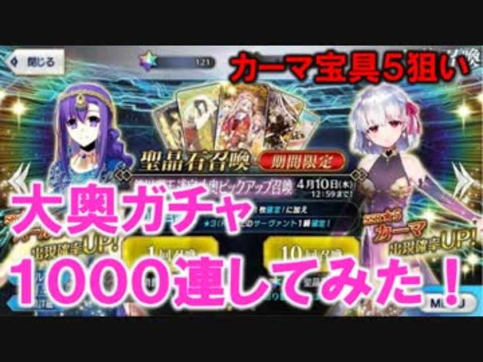 ▮動画情報▮<br>大奥ピックアップ1000連してみました。<br>本動画は2019年3月27日(水)のニコ生を録画、編集した動画になります。<br><br>欲しいキャラが実装されたけどガチャを我慢したい時に見に来てください。<br>FGOガチャを引く気が失せ、DWの収入減につながったら幸いです。今回は僕が養分になります。<br><br>たくさんの再生、コメント、マイリス、広告ありがとうございます!<br>あまり動画投稿しないので励みにまります(4/7追記)<br><br>カーマ絆15記念動画を作成しました。<br>下部にリンク貼ります。漢の魂を込めました。(8/26追記)<br><br><br>▮予告▮<br>桜系サーヴァント、村正、コヤンスカヤ実装までガチャ禁します。(多分)<br>次回ガチャ動画は上記サーヴァントが実装された際に投稿予定です。<br><br><br>▮リンク▮<br>カーマ絆15記念動画→<a href="https://www.nicovideo.jp/watch/sm35591361" class="watch">sm35591361</a><br>日常配信や未来の愉悦部はこちら!→co3060613<br>元気な時のガチャ動画はこちら!→<a href="https://www.nicovideo.jp/watch/sm34727811" class="watch">sm34727811</a><br><br>投稿ガチャ動画まとめ→<a href="https://www.nicovideo.jp/mylist/65195211" target="_blank" rel="noopener">mylist/65195211</a><br>Twitter→<a href="https://twitter.com/tenpa25252" target="_blank" rel="noopener nofollow">https://twitter.com/tenpa25252</a><br><br><br>▮忙しい人向けジャンプ■<br><a href="#" class="seekTime" data-seekTime="0:01" onclick="seekNicoPlayer('#0:01'); return false;">#0:01</a> 導入【怒りの日】 <br><a href="#" class="seekTime" data-seekTime="2:05" onclick="seekNicoPlayer('#2:05'); return false;">#2:05</a> 愉悦 序 <br><a href="#" class="seekTime" data-seekTime="21:24" onclick="seekNicoPlayer('#21:24'); return false;">#21:24</a> 500連~ <br><a href="#" class="seekTime" data-seekTime="34:24" onclick="seekNicoPlayer('#34:24'); return false;">#34:24</a> 愉悦 破 <br><a href="#" class="seekTime" data-seekTime="35:39" onclick="seekNicoPlayer('#35:39'); return false;">#35:39</a> 1000連で出来ること<br><a href="#" class="seekTime" data-seekTime="37:00" onclick="seekNicoPlayer('#37:00'); return false;">#37:00</a> おまけ