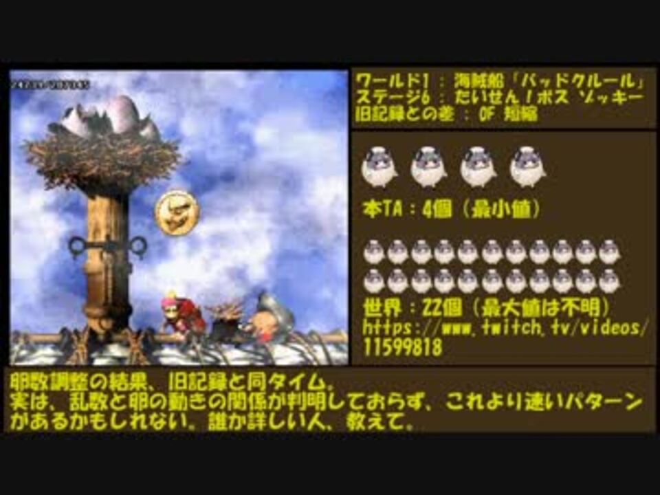 <span style="font-size: 24px;">これは旧記録です。新記録→<a href="https://www.nicovideo.jp/watch/sm37709465" class="watch">sm37709465</a></span><br><br>USA版ドンキー2の102%TAの再投稿です。<br>旧記録(<a href="https://www.nicovideo.jp/watch/sm17643863" class="watch">sm17643863</a>)から1分42秒ほど更新しました。<br><br>「DONKEY KONG COUNTRY 2 (SUPER DONKEY KONG 2)」を以下の目的・条件でプレイ。<br>・タイムアタック(Speedrun)<br>・102%<br>・DKコイン全回収<br>・USA ROM ver1.0使用<br><br>W1~W2:ここ<br>W3~W4:<a href="https://www.nicovideo.jp/watch/sm35347007" class="watch">sm35347007</a><br>W5~LW:<a href="https://www.nicovideo.jp/watch/sm35346898" class="watch">sm35346898</a><br>W6~W7:<a href="https://www.nicovideo.jp/watch/sm35346695" class="watch">sm35346695</a><br><a href="https://www.nicovideo.jp/mylist/65191458" target="_blank" rel="noopener">mylist/65191458</a><br><br /><strong><u>■他の自作動画</u></strong><br>自作動画Part1一覧:<a href="https://www.nicovideo.jp/mylist/63236146" target="_blank" rel="noopener">mylist/63236146</a><br><span style="font-size: 10px;">┣<a href="https://www.nicovideo.jp/watch/sm36503321" class="watch">sm36503321</a>:ドンキー1 Any 【7:24 世界記録】<br>┣<a href="https://www.nicovideo.jp/watch/sm35023535" class="watch">sm35023535</a>:ドンキー2 True Ending【33:27 世界記録】<br>┣<a href="https://www.nicovideo.jp/watch/sm34926516" class="watch">sm34926516</a>:ドンキー2 Any【35:34 世界記録】<br>┗<a href="https://www.nicovideo.jp/watch/sm34631204" class="watch">sm34631204</a>:ドンキー2 Warpless【44:59 世界記録】</span><br>更新案・ネタ:<a href="https://www.nicovideo.jp/mylist/65090331" target="_blank" rel="noopener">mylist/65090331</a><br><span style="color: #ff0000; font-size: 10px;">┣<a href="https://www.nicovideo.jp/watch/sm38050288" class="watch">sm38050288</a>:ドンキー1 101【パンチラメクーリさんが大晦日に投稿した新作】</span><br><span style="font-size: 10px;">┗<a href="https://www.nicovideo.jp/watch/sm36733026" class="watch">sm36733026</a>:ドンキー2 きりたんが壁の中にサルを入れる話</span>