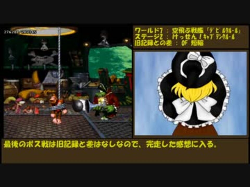 DKコイン全回収しなくとも102%は達成できるが、DKコインは全回収する。<br><br>「DONKEY KONG COUNTRY 2 (SUPER DONKEY KONG 2)」を以下の目的・条件でプレイ。<br>・タイムアタック(Speedrun)<br>・102%<br>・DKコイン全回収<br>・USA ROM ver1.0使用<br><br>W1~W2:<a href="https://www.nicovideo.jp/watch/sm34905453" class="watch">sm34905453</a><br>W3~W4:<a href="https://www.nicovideo.jp/watch/sm34905519" class="watch">sm34905519</a><br>W5~LW:<a href="https://www.nicovideo.jp/watch/sm34905646" class="watch">sm34905646</a><br>W6~W7:ここ<br><a href="https://www.nicovideo.jp/mylist/65191458" target="_blank" rel="noopener">mylist/65191458</a><br><br /><strong><u>■他の自作動画</u></strong><br>自作動画Part1一覧:<a href="https://www.nicovideo.jp/mylist/63236146" target="_blank" rel="noopener">mylist/63236146</a><br><span style="font-size: 10px;">┣<a href="https://www.nicovideo.jp/watch/sm36503321" class="watch">sm36503321</a>:ドンキー1 Any 【7:24 世界記録】<br>┣<a href="https://www.nicovideo.jp/watch/sm35023535" class="watch">sm35023535</a>:ドンキー2 True Ending【33:27 世界記録】<br>┣<a href="https://www.nicovideo.jp/watch/sm34926516" class="watch">sm34926516</a>:ドンキー2 Any【35:34 世界記録】<br>┗<a href="https://www.nicovideo.jp/watch/sm34631204" class="watch">sm34631204</a>:ドンキー2 Warpless【44:59 世界記録】</span><br>更新案・ネタ:<a href="https://www.nicovideo.jp/mylist/65090331" target="_blank" rel="noopener">mylist/65090331</a><br><span style="color: #ff0000; font-size: 10px;">┣<a href="https://www.nicovideo.jp/watch/sm38050288" class="watch">sm38050288</a>:ドンキー1 101【パンチラメクーリさんが大晦日に投稿した新作】</span><br><span style="font-size: 10px;">┗<a href="https://www.nicovideo.jp/watch/sm36733026" class="watch">sm36733026</a>:ドンキー2 きりたんが壁の中にサルを入れる話</span>